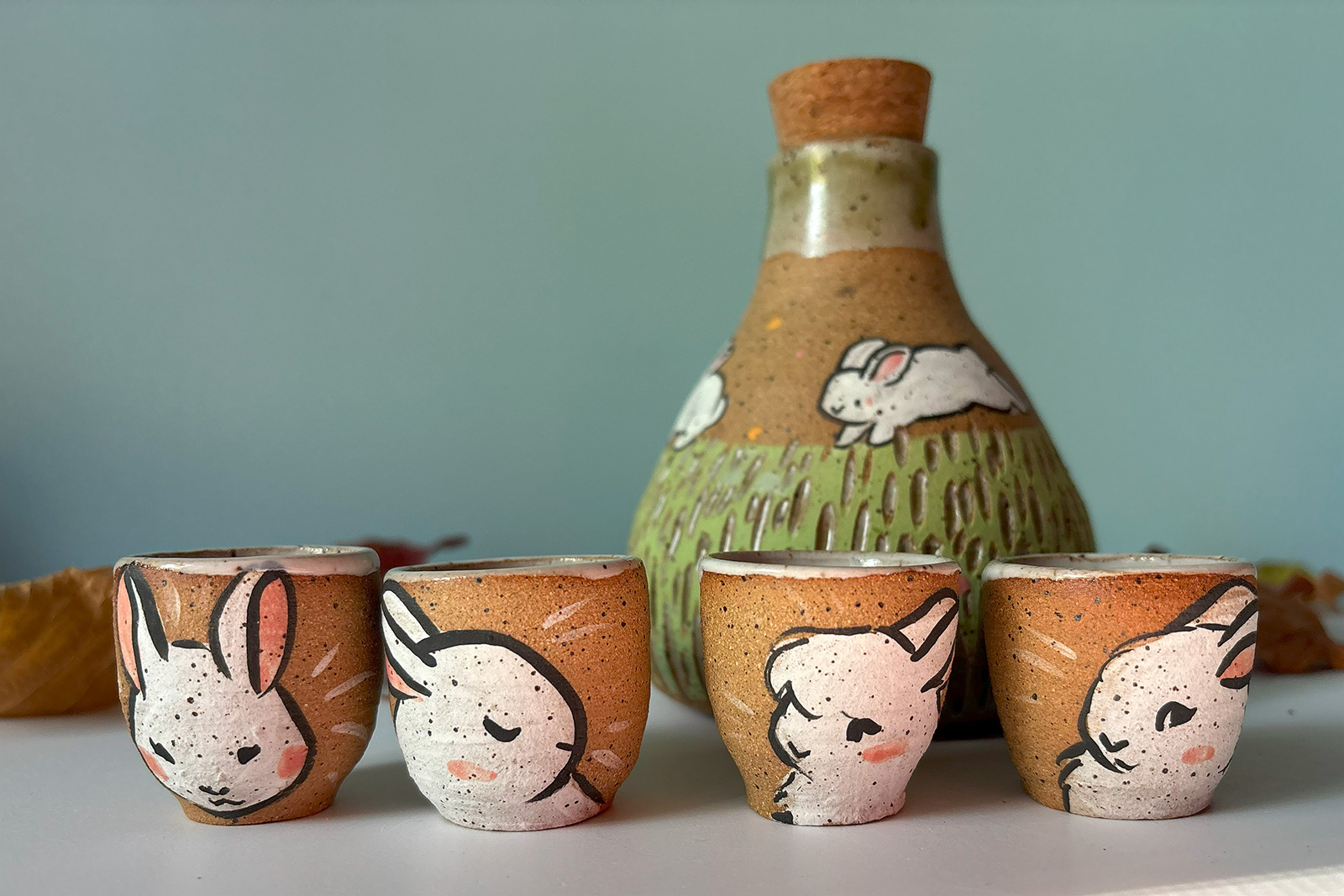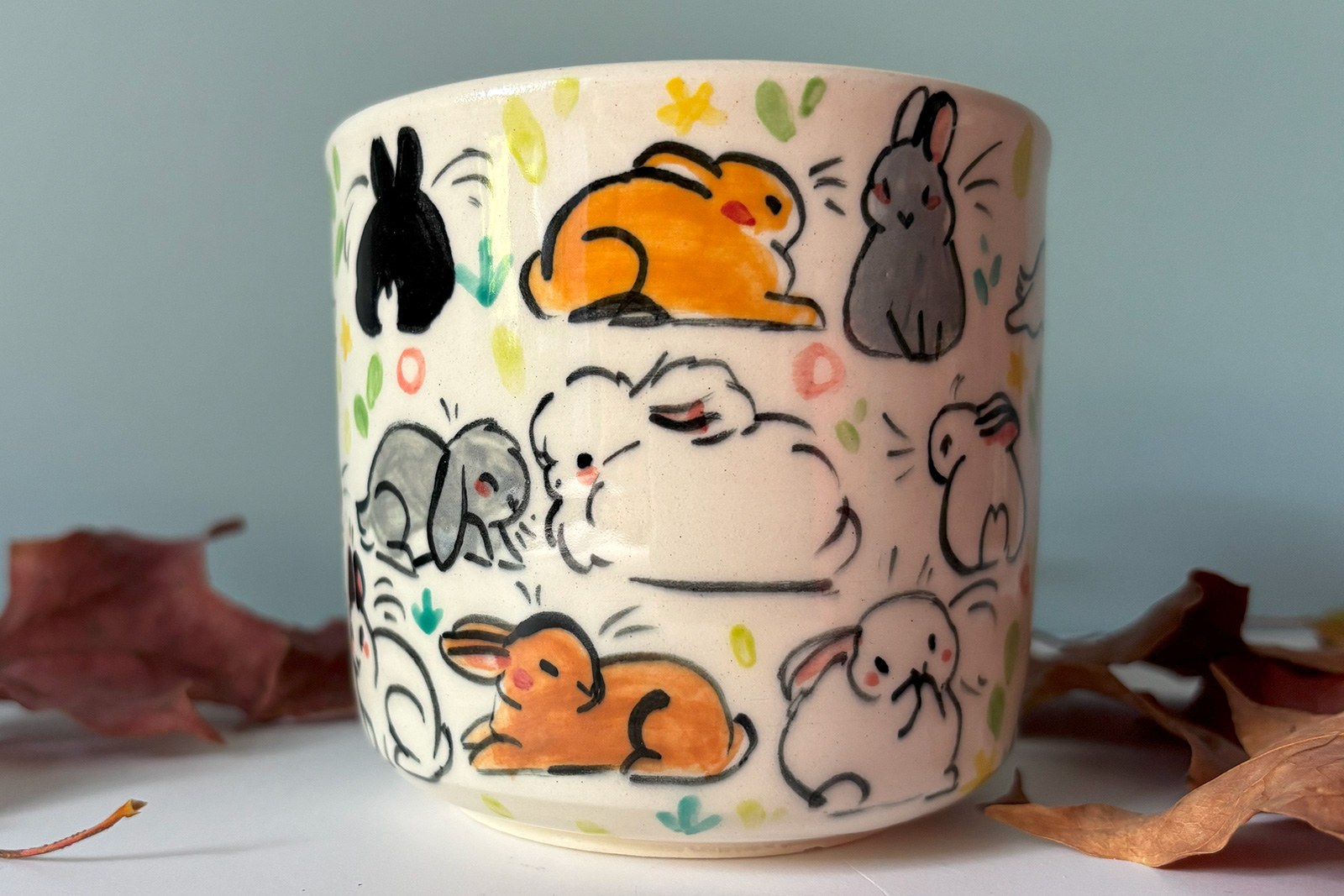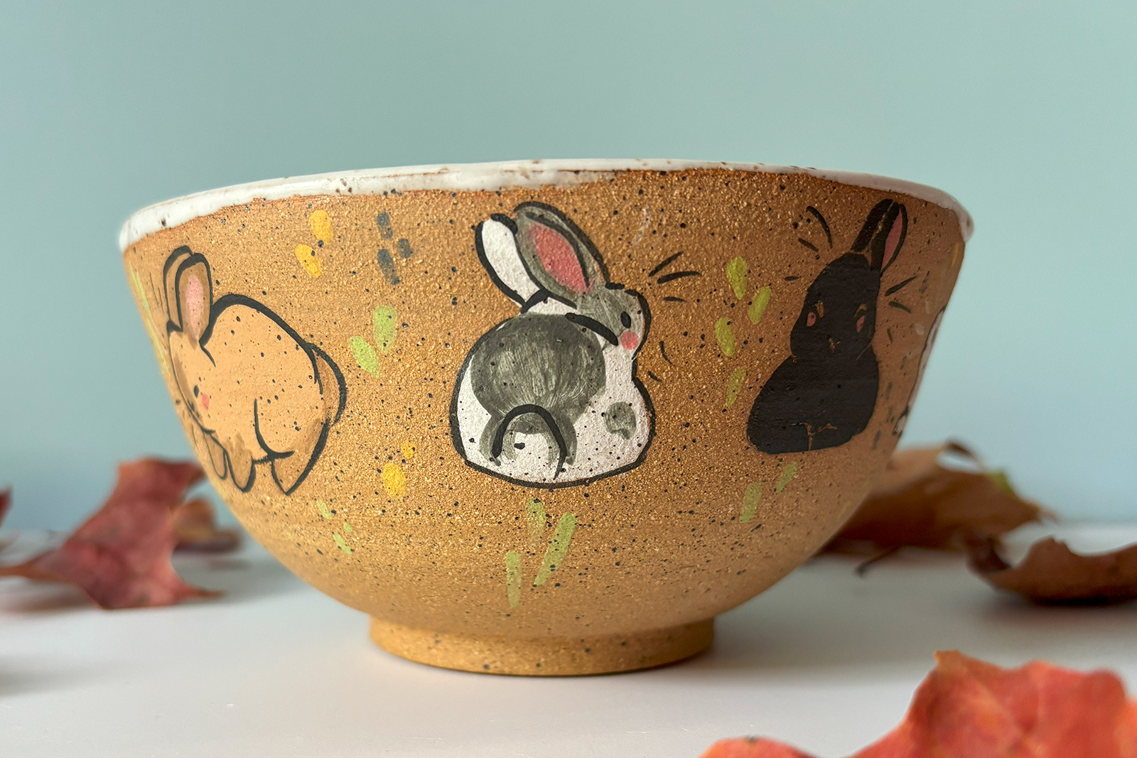 I wanted it simple with a cute bunny figure resting on the lid. My customer asked for bunny illustrations on the sides of the vessel. To this, I added dandelions, which happened to be this little rabbit’s favorite food.