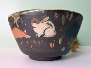 A wide bowl of about 17 cm wide and 10 cm high. This black stoneware piece of pottery is handmade with Canadian clay and painted with several adorable bunnies. I glazed the inside with a lovely color contrasting nicely with the dark stoneware. One of a kind.
