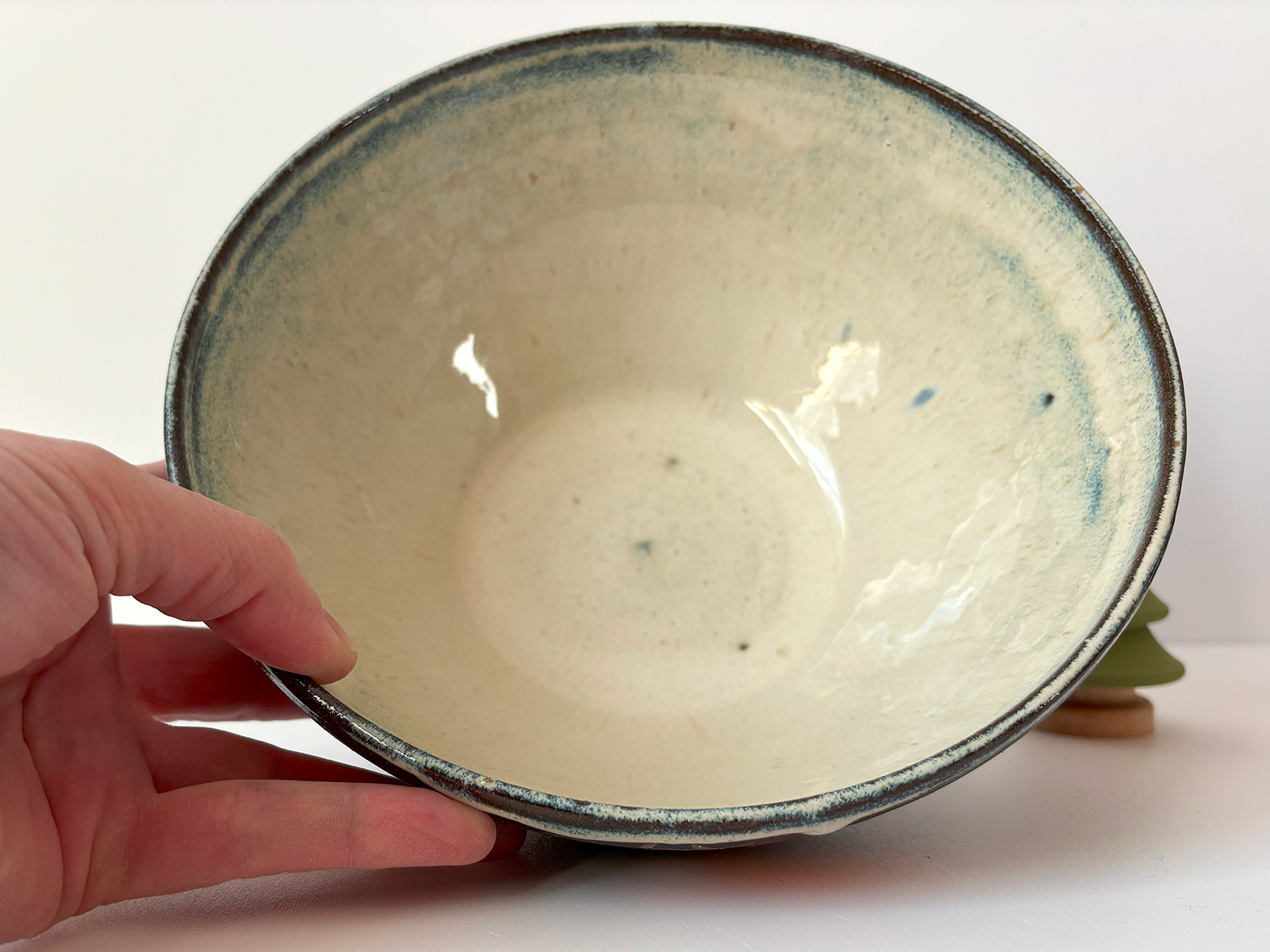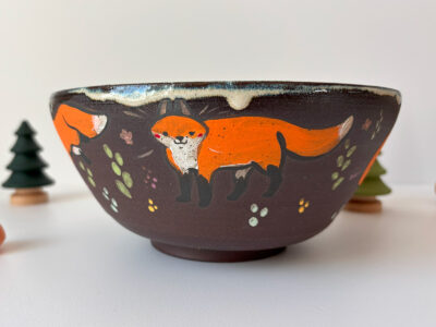 Here is a large bowl in black stoneware, painted with red foxes. The inside is glazed, the outside is rough to the touch. This is a one of a kind piece of tableware, handmade in Canada. It’s approximately 18.5 cm wide and 6.5 cm high.