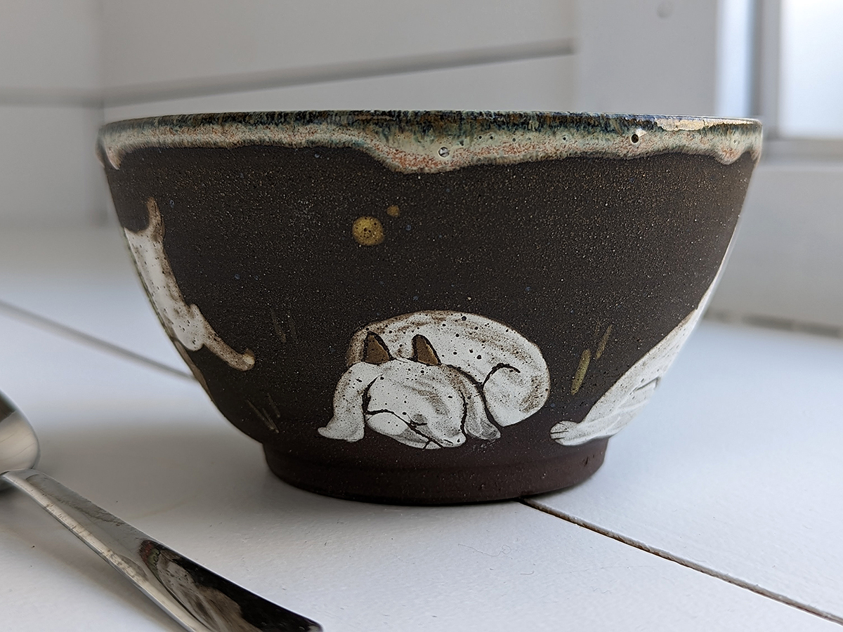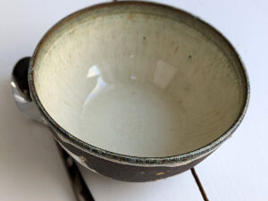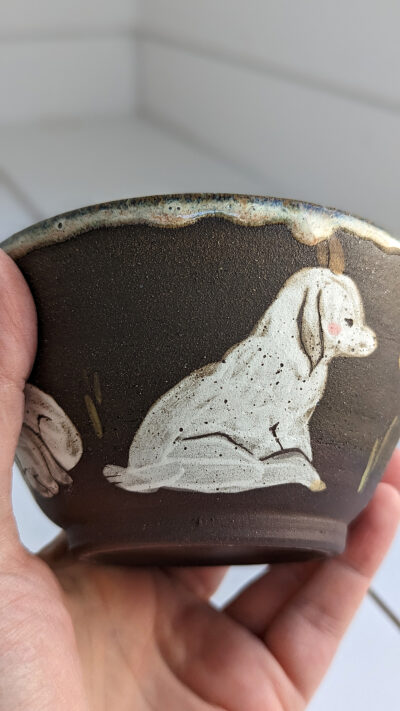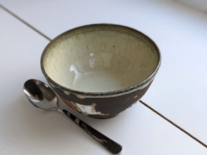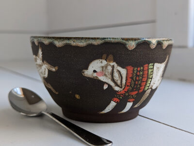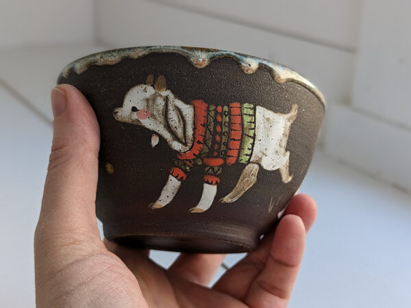 This one of a kind piece of pottery is entirely handmade from Canadian clay. Its rough outside is a warm black, contrasting nicely with the little white goats – one of them is in a sweater for extra cuteness. Inside the bowl is a lovely white glaze, making the piece food safe and adding more contrast with the black clay, somewhat showing under the glaze and adding depth to this unique bowl. It can be used as an everyday item or as a collectible piece and exhibited as such.