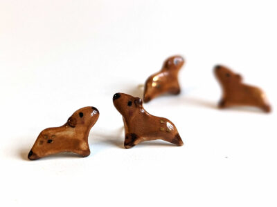 Small leaping capybaras earrings with gold highlights, porcelain on hypoallergenic vermeil studs. They are handcrafted and slightly different.