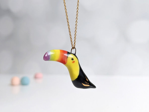 Small ceramics tucan pendant. Sculpted and painted in Montréal, this is a one of a kind piece. Each pendant is different and what you see is what you get 🙂