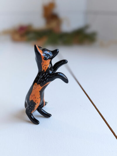 This standing figurine is a cross fox, handcrafted in Montréal. It’s about 8 cm high and stable on its hind legs.