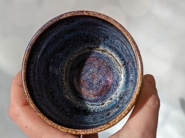 A stoneware cup illustrated with a Hellbender salamander. It’s a one of a kind piece, with a clear glaze outside and a textured blue inside. It’s about 8 cm wide and 7 cm high. By the way, if you don’t know what a Hellbender is, you can find more about them on this excellent documentary.