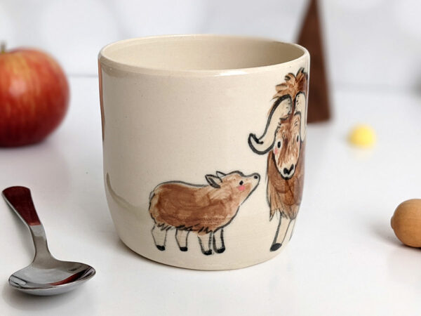 A very cute musk ox duo of mom and calf, painted on a handle less white stoneware cup. This one of a kind handmade piece is about 8 cm high and wide. It’s clear glazed and food safe, lovely for a hot or cold beverage at any time of day. It’s sturdy enough to go to the dishwasher, micro wave and your cupboard.