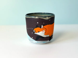 This is a lovely black cup, painted with a red fox. It’s handmade with lovely stoneware and glazed on the inside. It’s 8.5 cm wide and 9 cm tall. This one of a kind piece of adorable pottery would be perfect to hold a nice drink or a serving of ice cream.