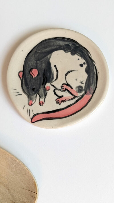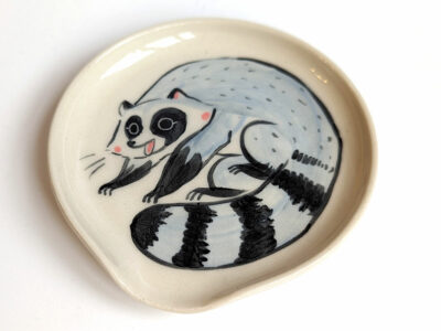A custom spoon rest is a small dish, around 4 inches wide or 10 cm wide, one side of the dish is flattened. It will be hand painted with the animal of your choice.