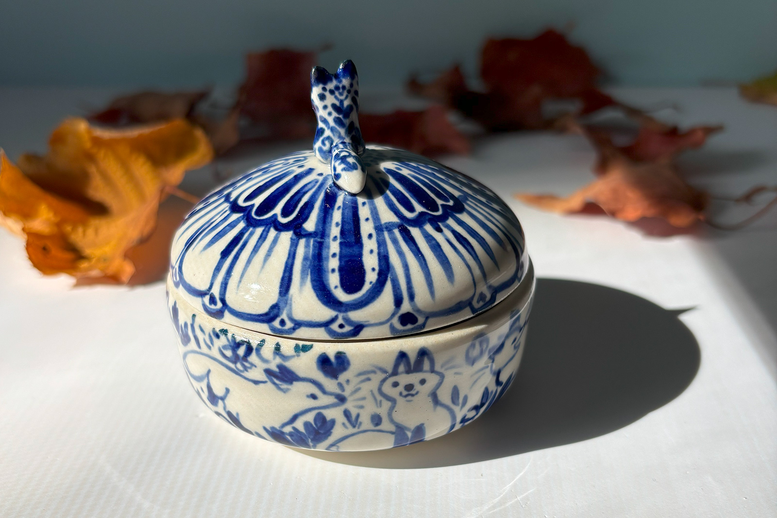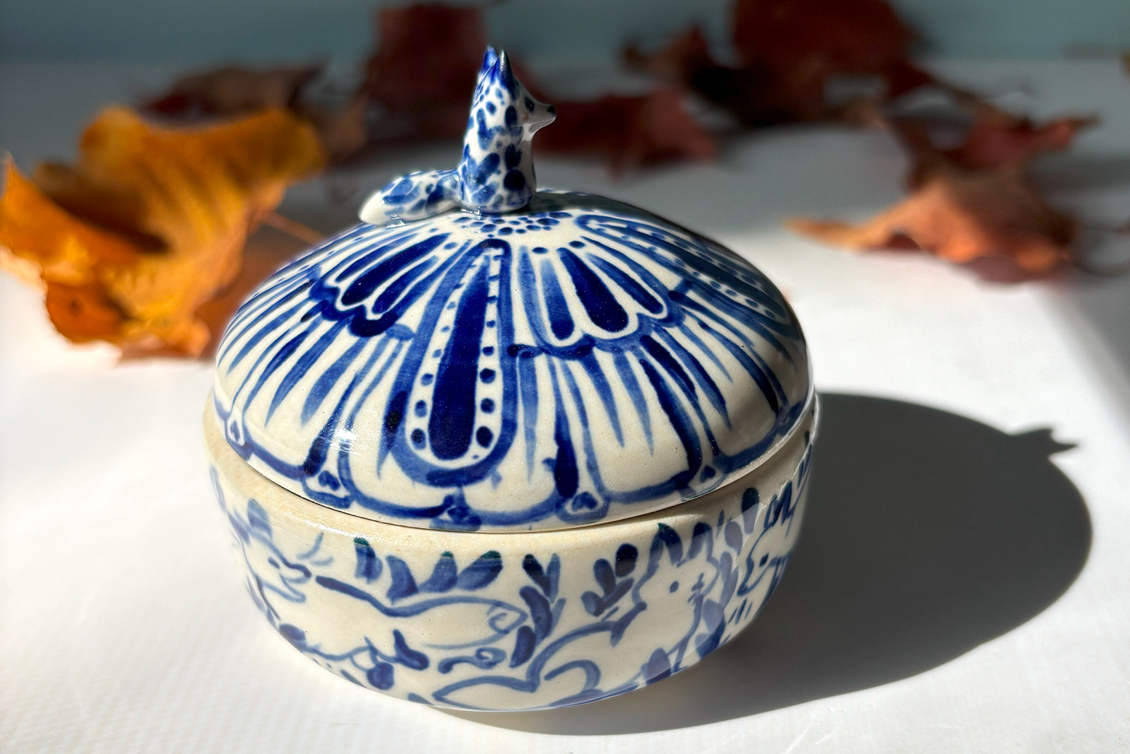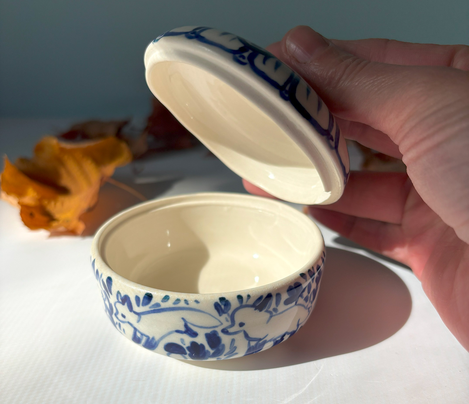 Tiny Jewelry Box with a sculpted lid. This is porcelain, it’s 6 cm wide and 6 cm tall approximately. This is perfect for necklaces and small earrings, or any tiny treasure of yours. The inside is glazed.