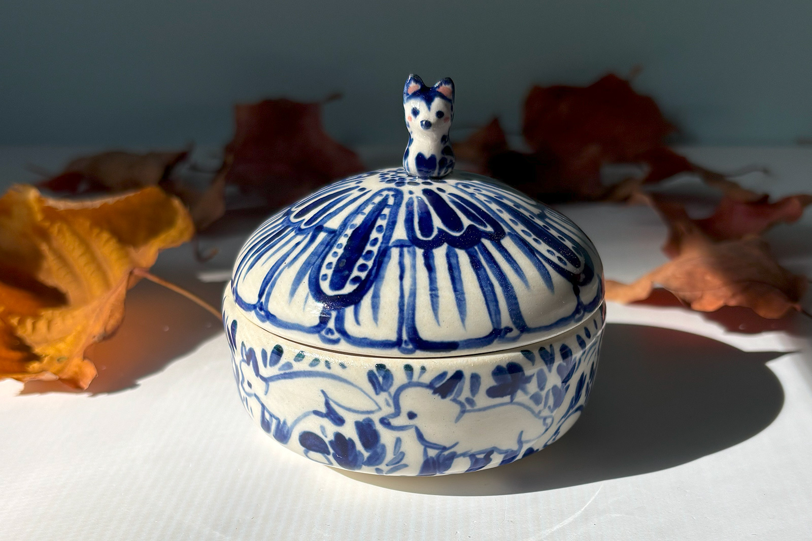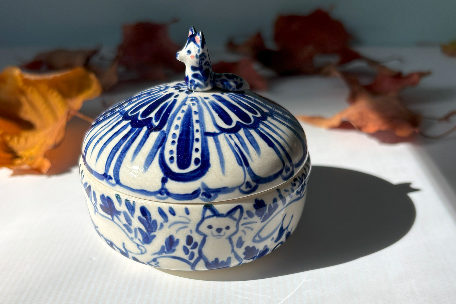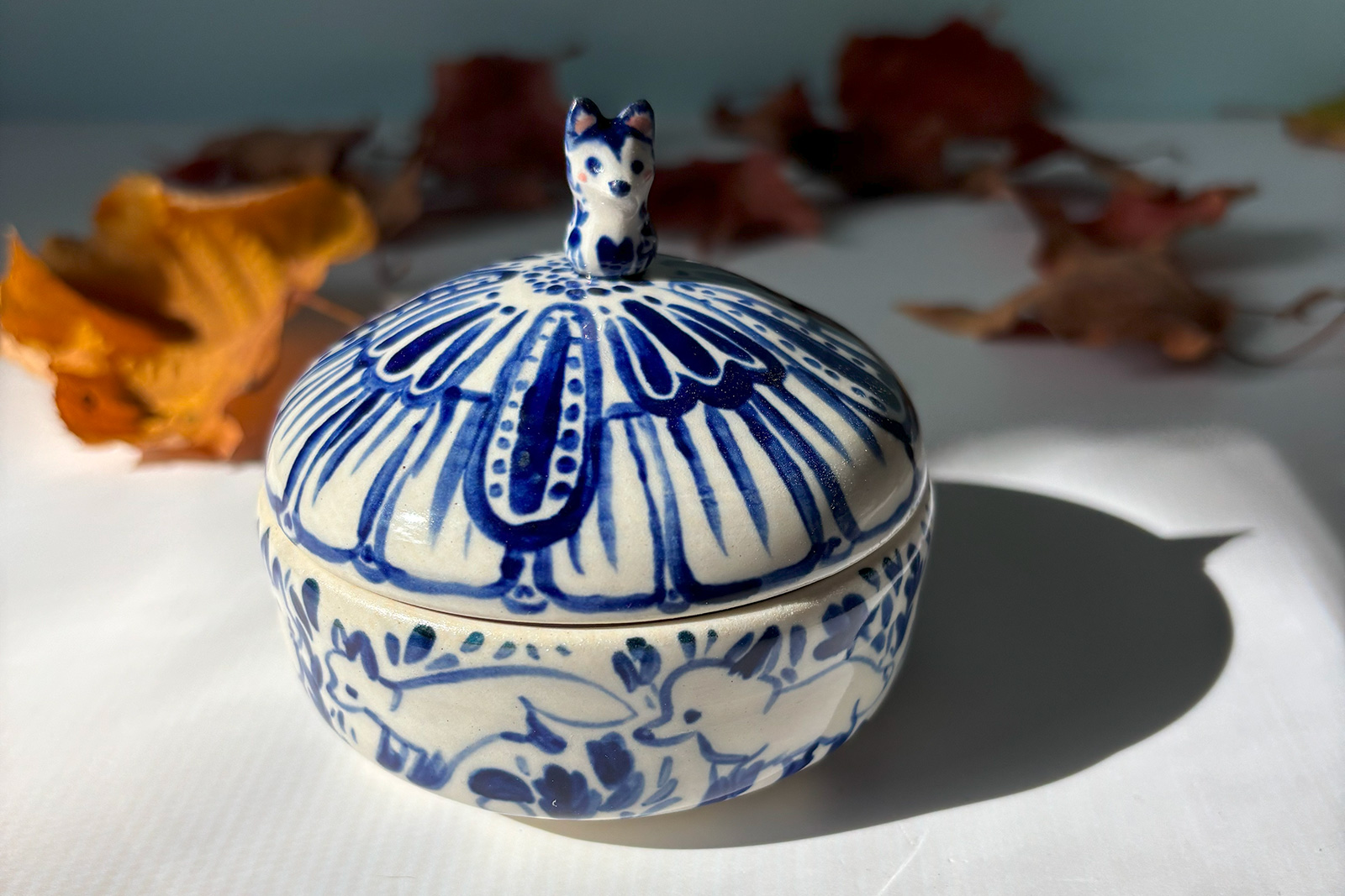 Tiny Jewelry Box with a sculpted lid. This is porcelain, it’s 6 cm wide and 6 cm tall approximately. This is perfect for necklaces and small earrings, or any tiny treasure of yours. The inside is glazed.