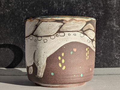 This piece is a one of a kind, handmade piece of very cute tableware. It’s 10.5 cm wide, 13 with the handle, and 9 cm high.