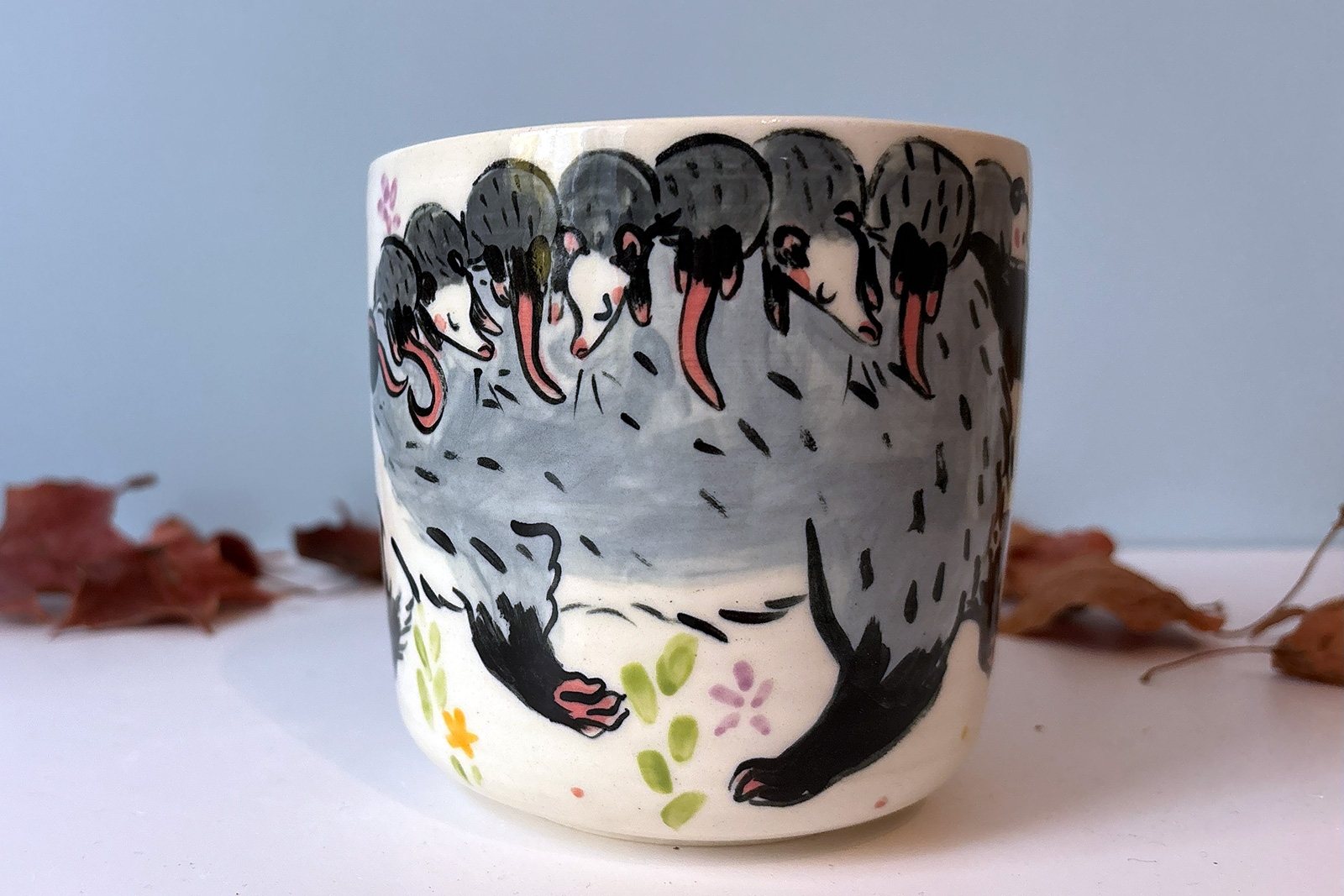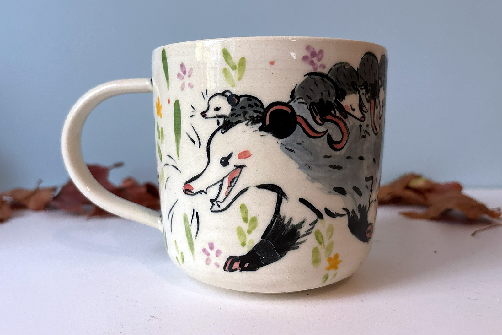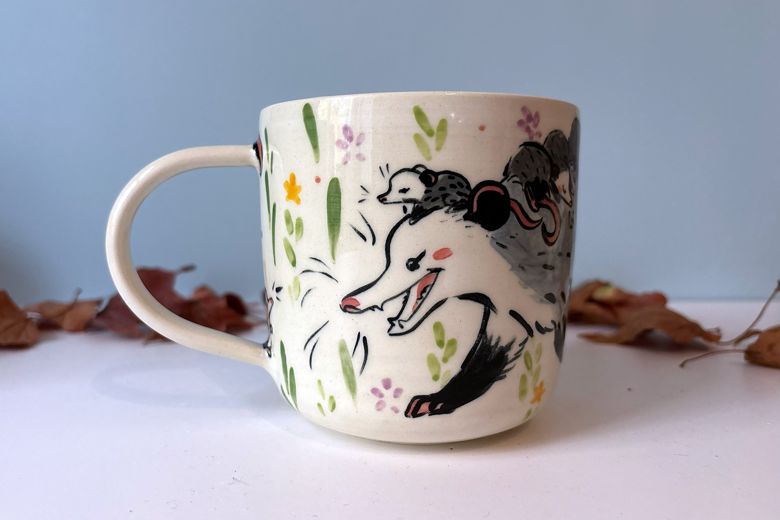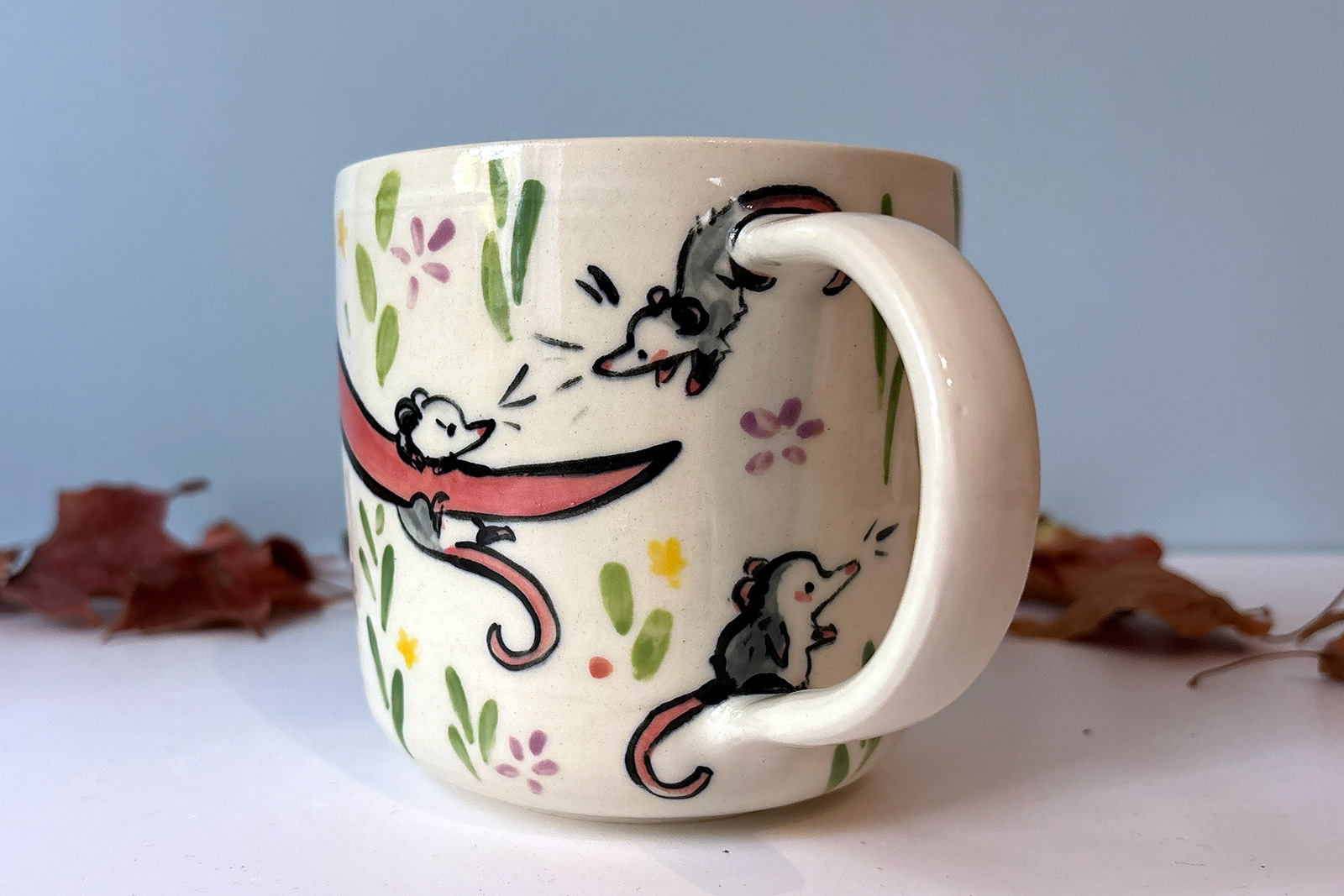 This stoneware mug has a lovely pulled handle and it’s made out of Canadian white porcelain. It’s a sturdy material, coated with food safe glaze and illustrated with a mama possum and her kits. One of them is wrapped around that handle, waiting to be picked up by the mom, who’s also a bus. It’s about 9 cm wide, around 12.5 with the handle, and 10 cm high.