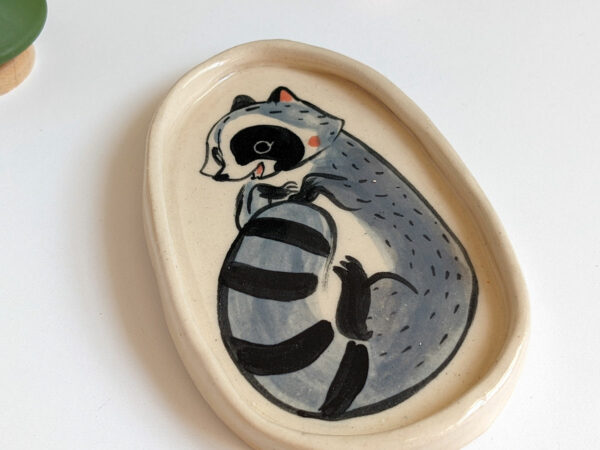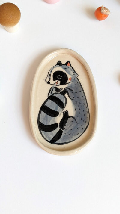 Pretty little oval catch all painted with a cute raccoon, this is a one of a kind handmade piece of ceramics. It’s made out of ivory colored porcelain and coated in a food safe clear glaze. This piece is part of a trio of american animals catch all with the same shape and size. It’s about 7.5 cm wide at the widest, and 12 cm long.