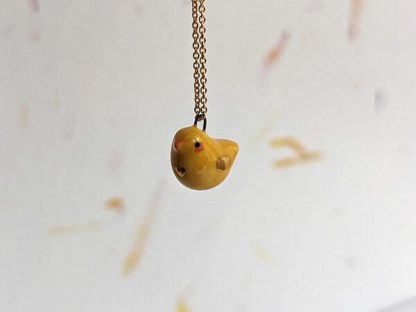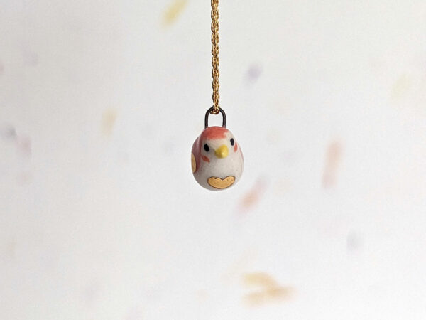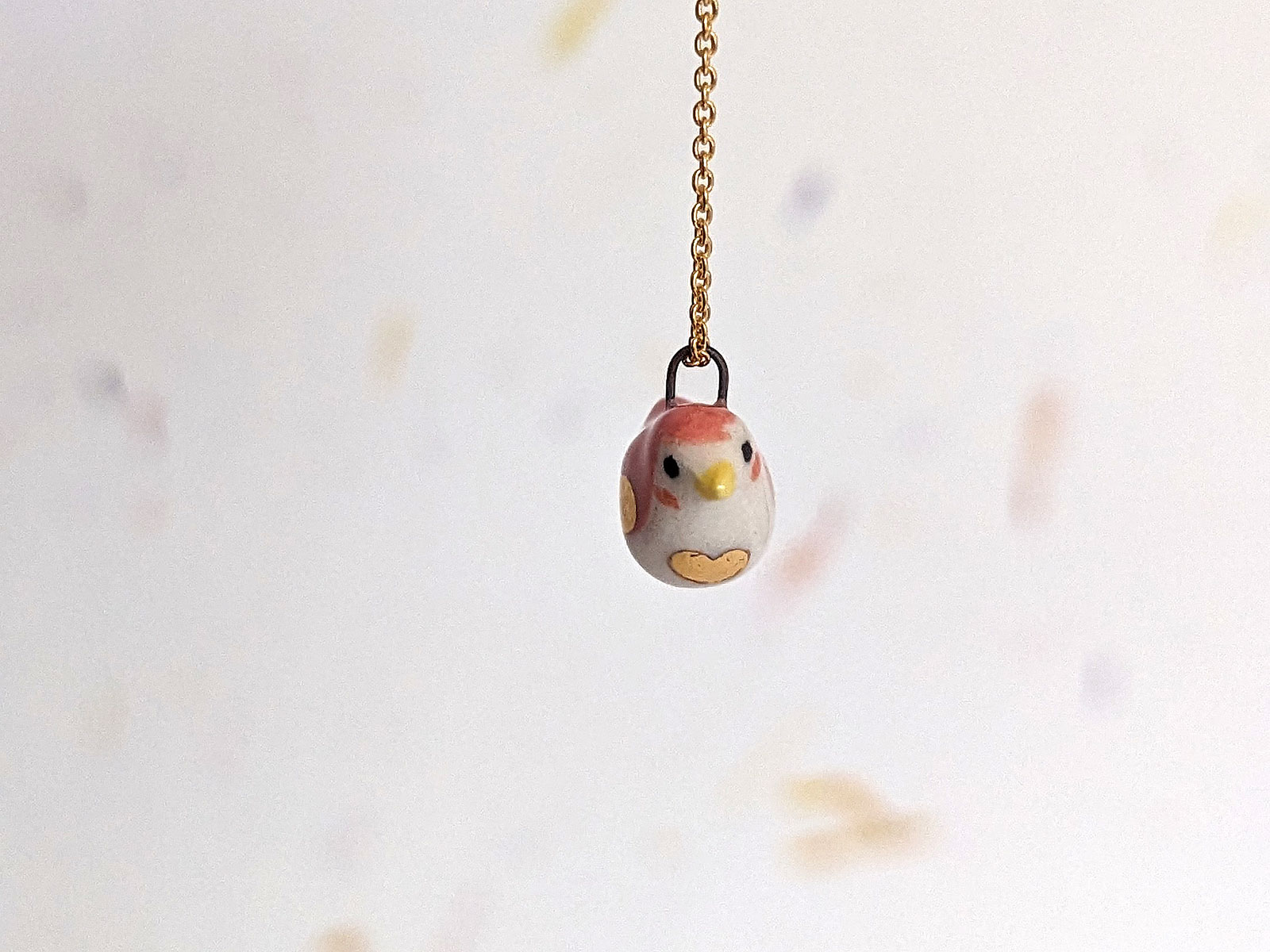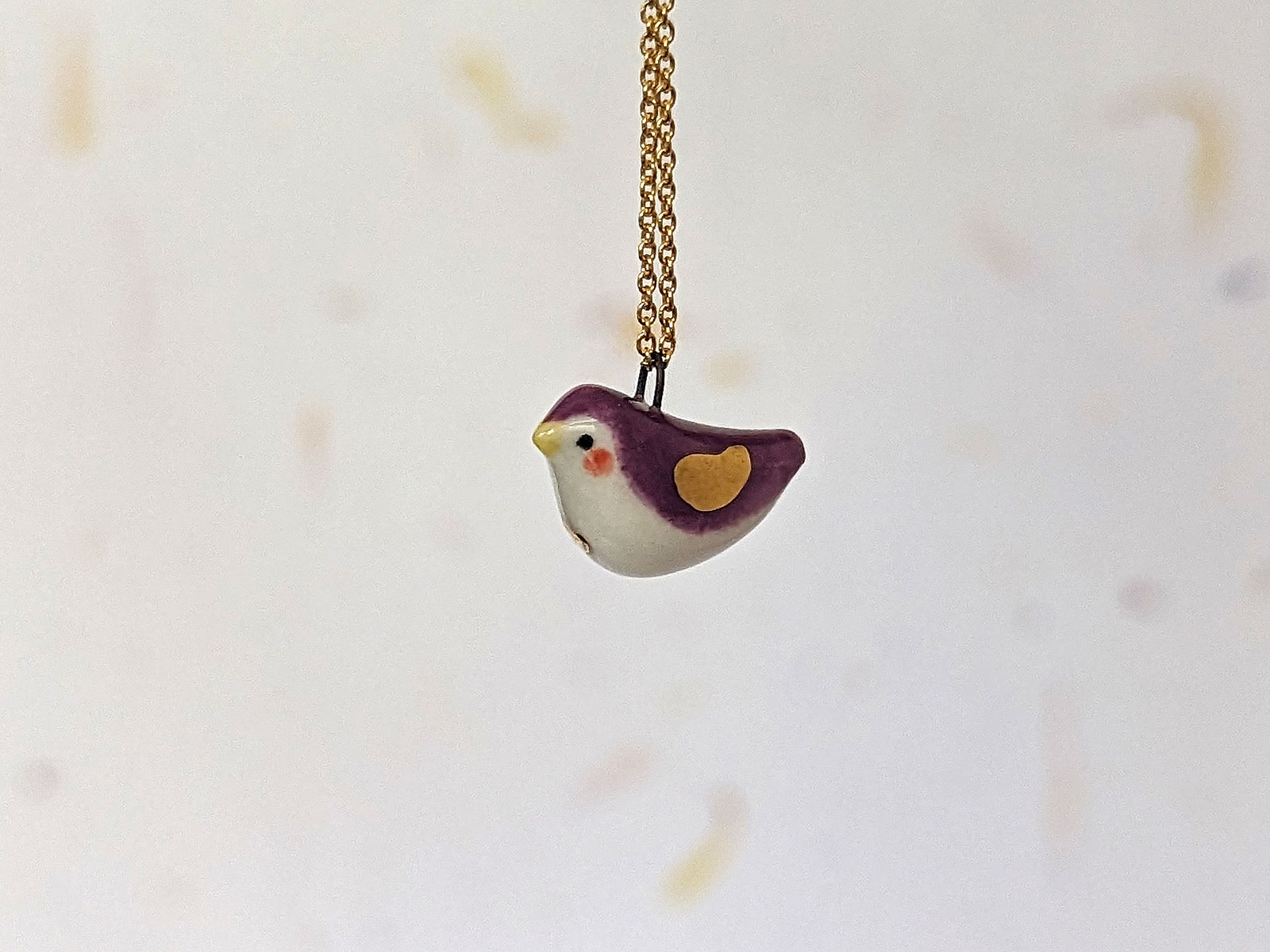 Adorable cute round birds made out of porcelain and made as precious little pendants. Each one has a little gold detail, often on the wings and a little heart.