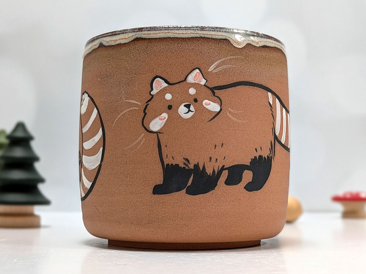 A red stoneware medium pot, illustrated with several red pandas. It measures approximately 10.5cm in diameter and height. It can be used as a holder for pencils, utensils or any other small thing.