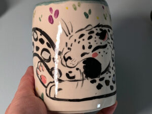 It’s painted with a lovely snow leopard playfully biting it’s tail, painted by hand on white porcelain.