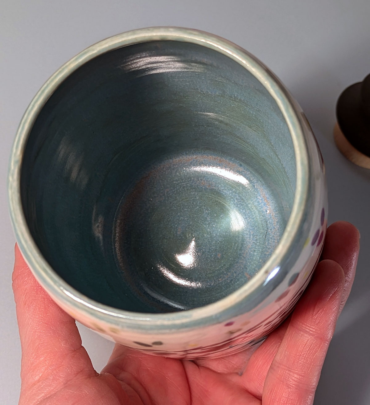 This little pot can be used as an utensil holder, a pencil or brush holder, or it can store small items. It can also be used for beverages but it’s heavy enough to hold things so it might not be the ideal drinking vessel.