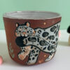 This is a service set made for delicacies such as sake, whisky or simply for the beauty of it. Each piece is made in a lovely toasty speckled clay and glazed on the inside. The bottle is carved and illustrated all around, each little shot has a small illustration recalling the bottle’s design.