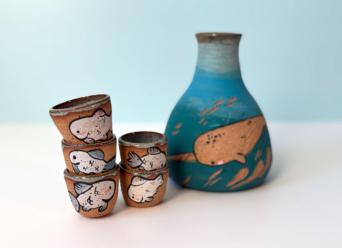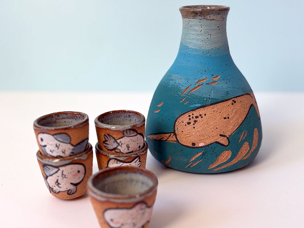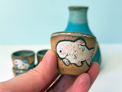 This is a service set made for delicacies such as sake, whisky or simply for the beauty of it. Each piece is made in a lovely toasty speckled clay and glazed on the inside. The bottle is carved and illustrated all around, each little shot has a small illustration recalling the bottle’s design.