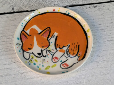A cute corgi on a saucer. This one of a kind handmade piece of stoneware is handmade in Québec, Canada. This is a lovely addition to a tableware collection, a hallway console or anywhere in need of a cute little piece of décor. It can be used for food as well as a trinket or jewelry tray.