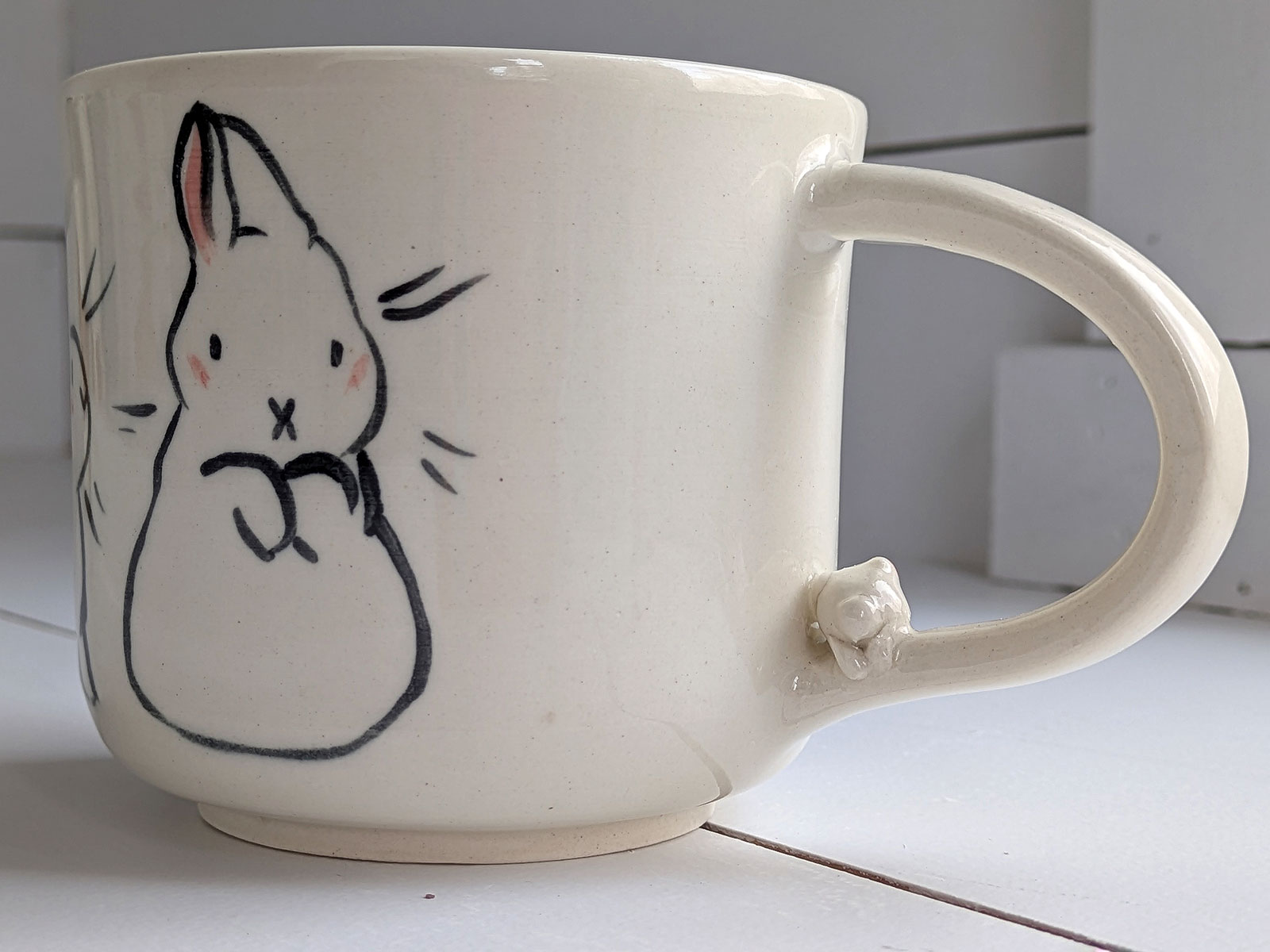 An adorable little mug with a tiny sleepy bunny sculpted inside the handle.
