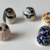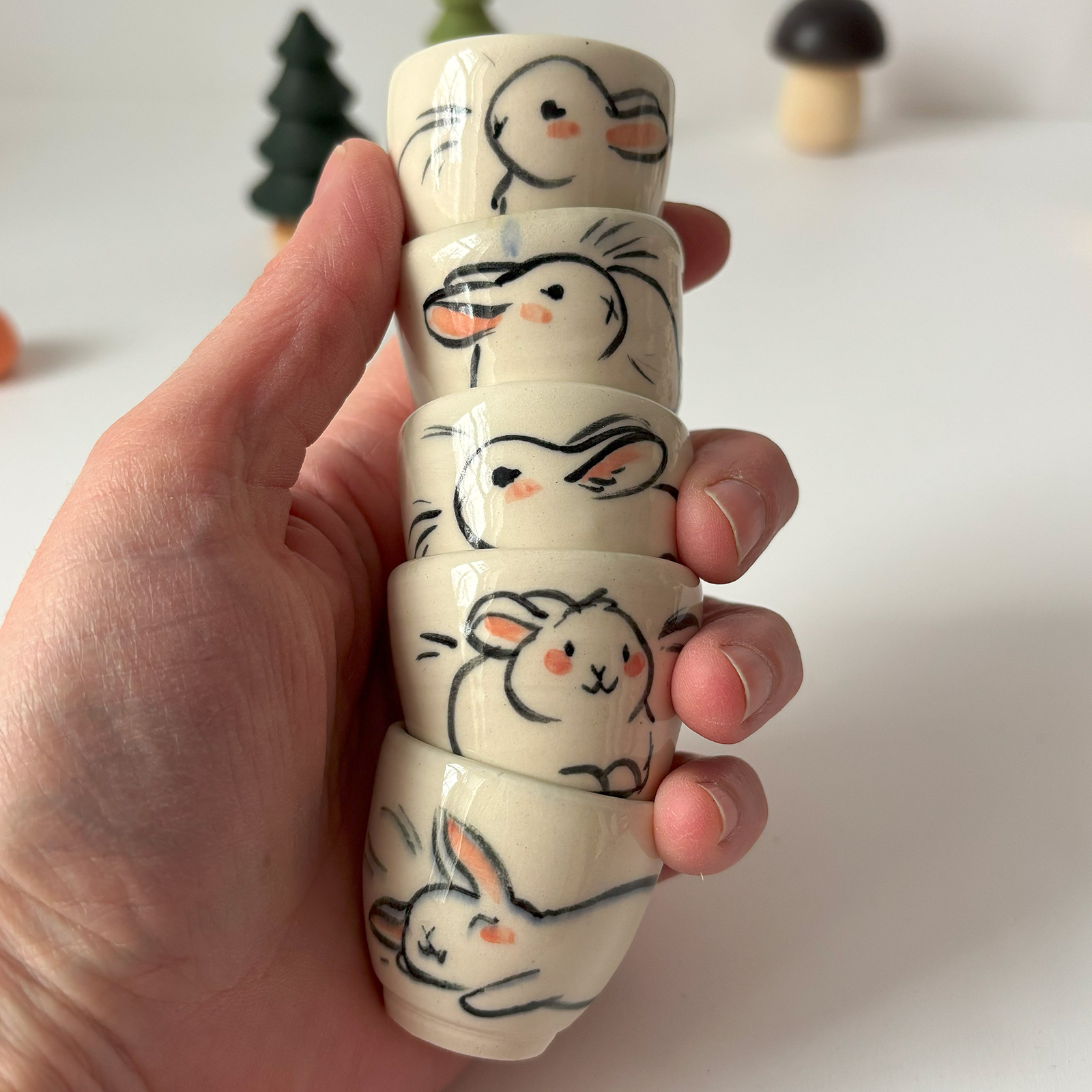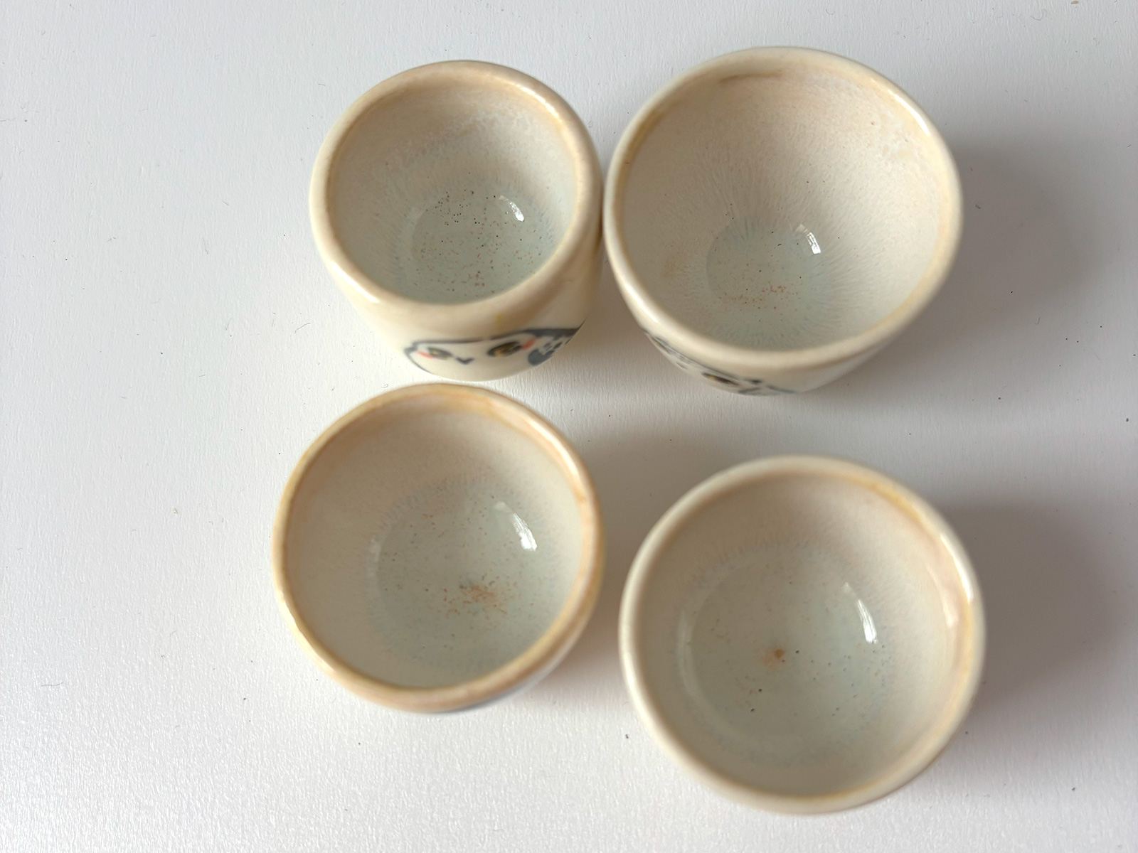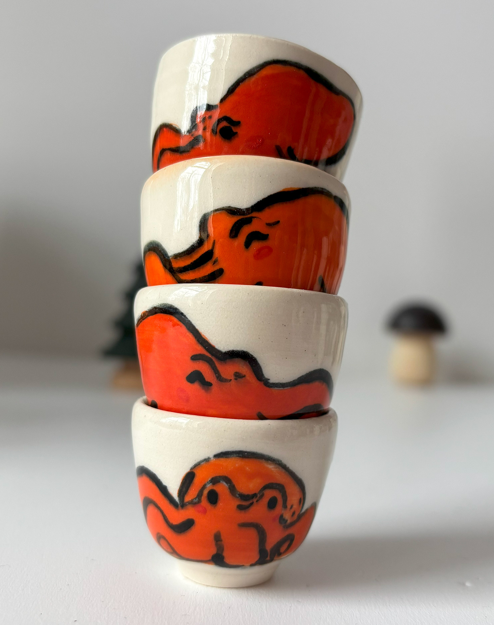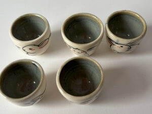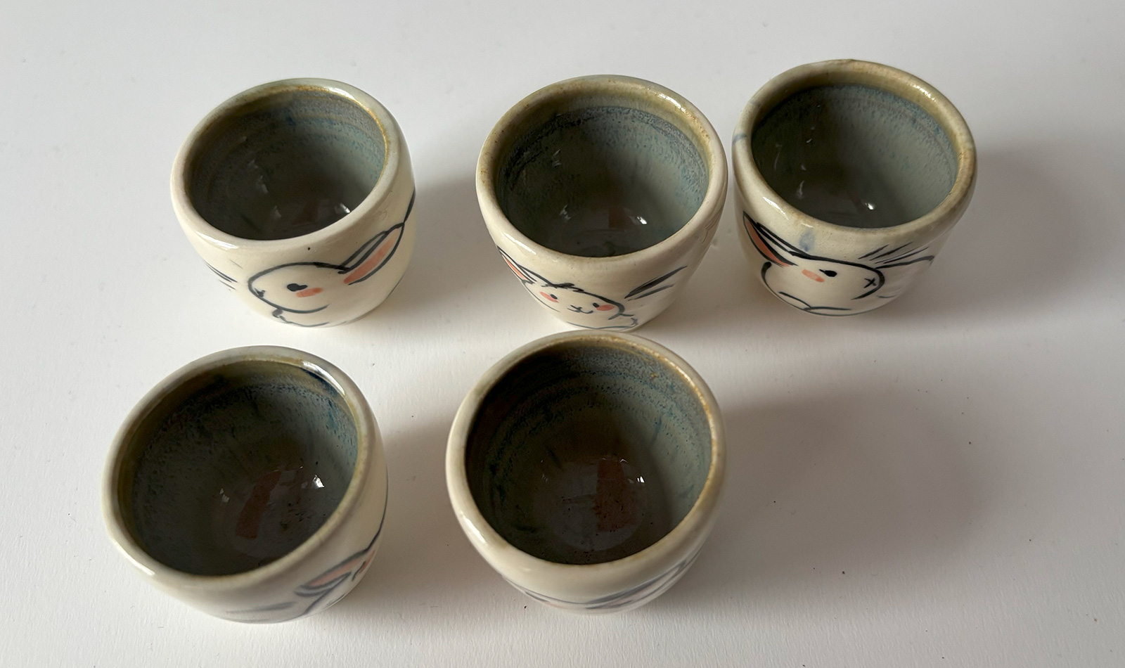 These are little shot cups thrown for a new throwing technique. I’m always learning and it means making small batches of uneven little cups. They’re still pretty and I love the glazes. These are offered for a small price to reflect the varying sizes : they’re all between 3 and 4 cm wide and high.