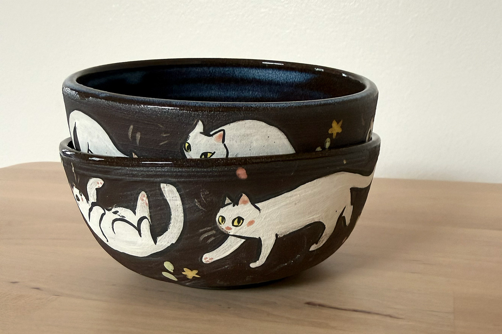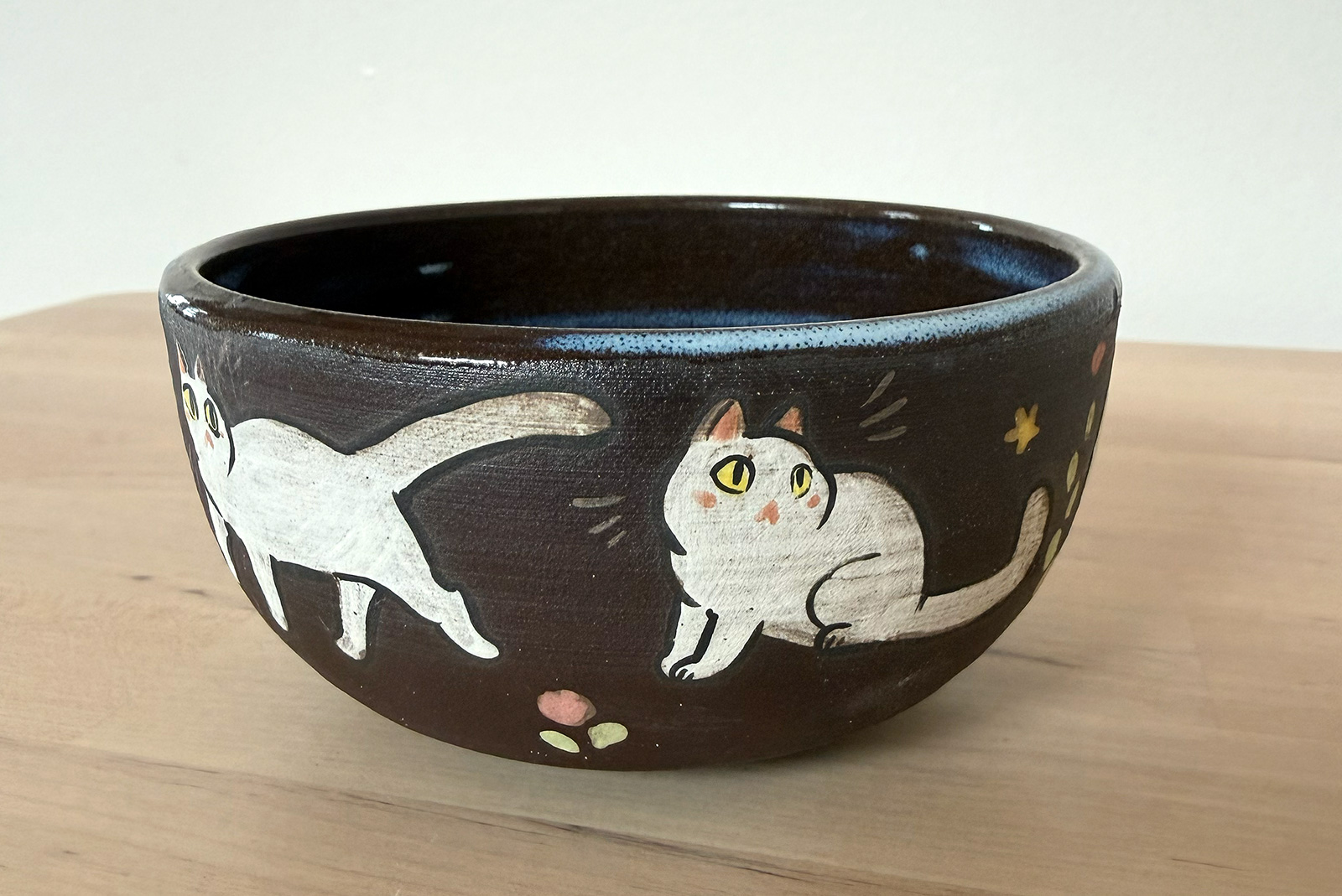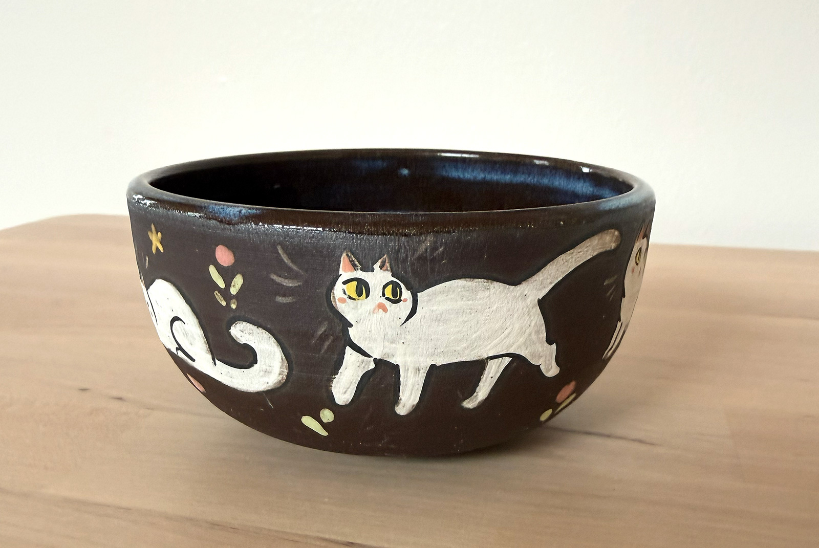 Small black stoneware dish painted with white cats. This is like a ramequin, around 10 cm wide and 5 cm tall. One of a kind, the price is for one piece. There are two similar cups and one is sent at random.