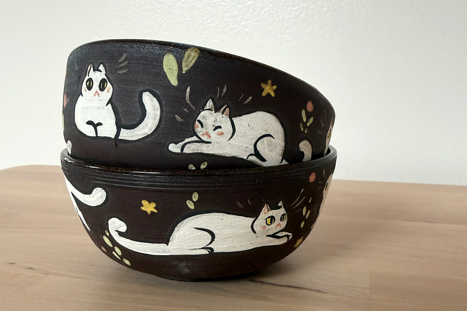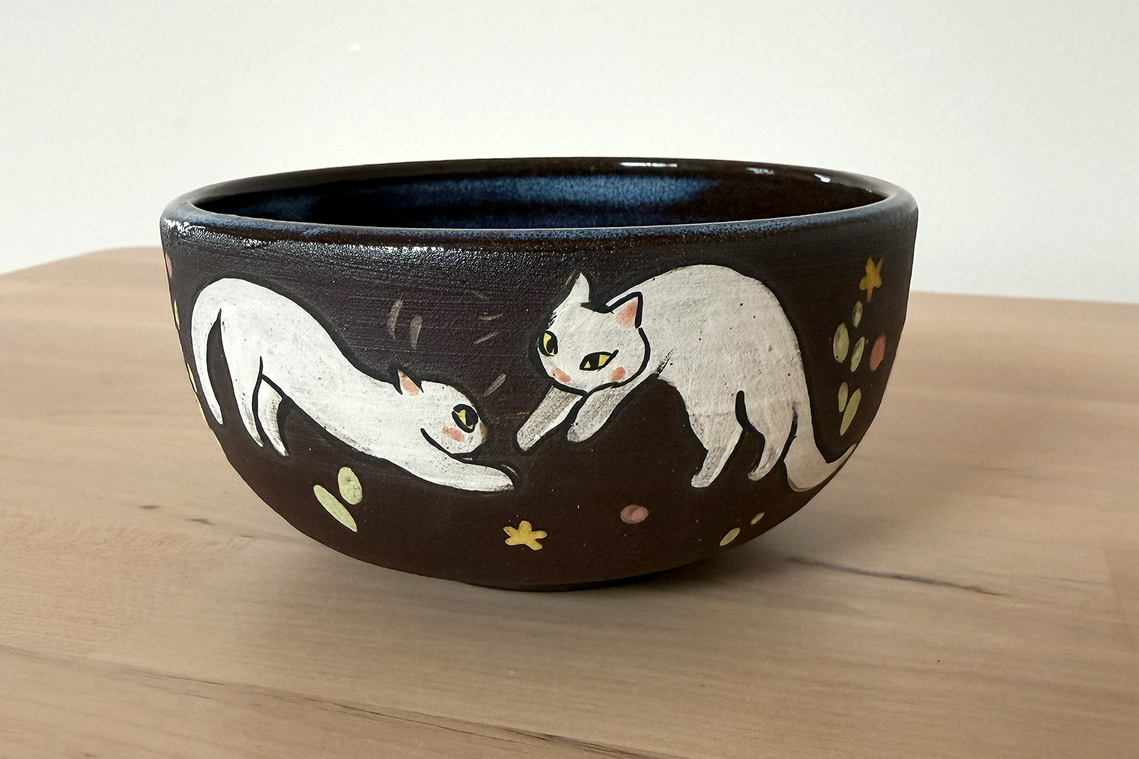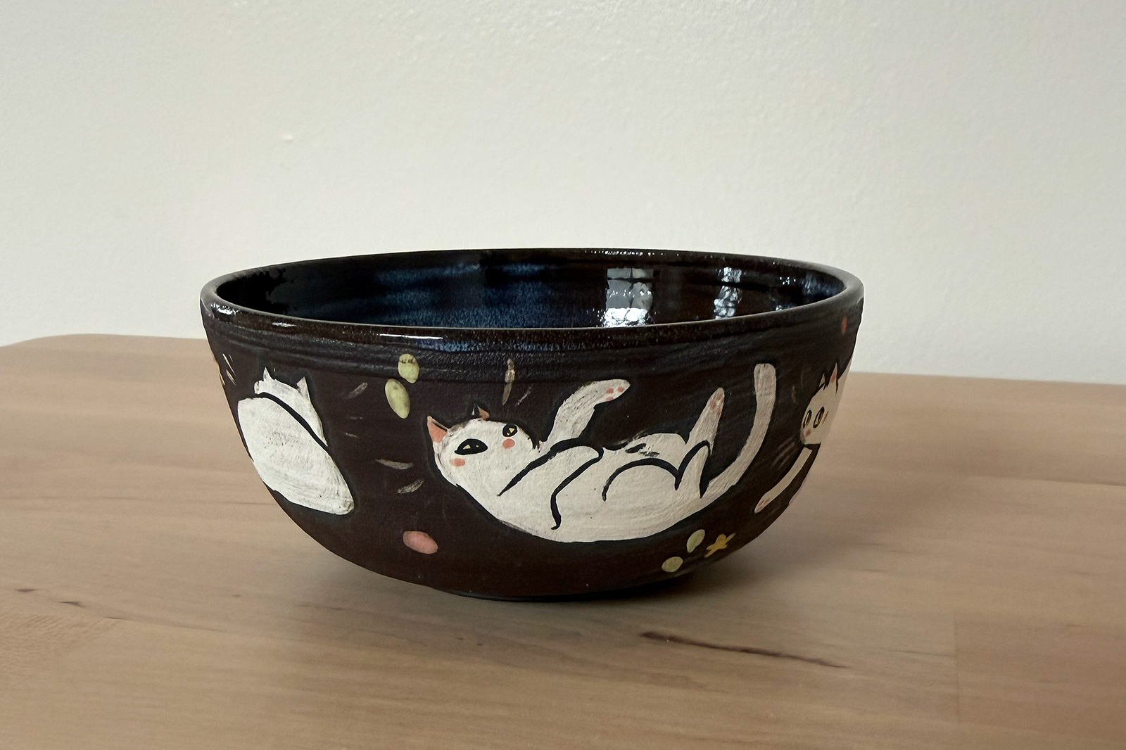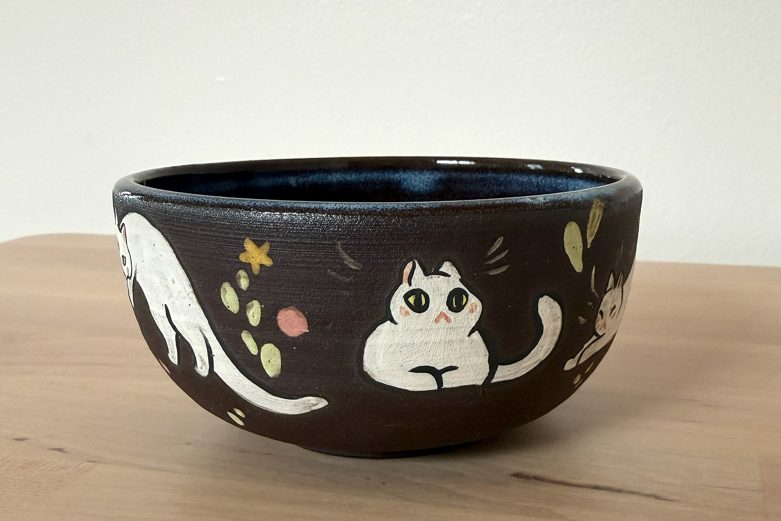 Small black stoneware dish painted with white cats. This is like a ramequin, around 10 cm wide and 5 cm tall. One of a kind, the price is for one piece. There are two similar cups and one is sent at random.