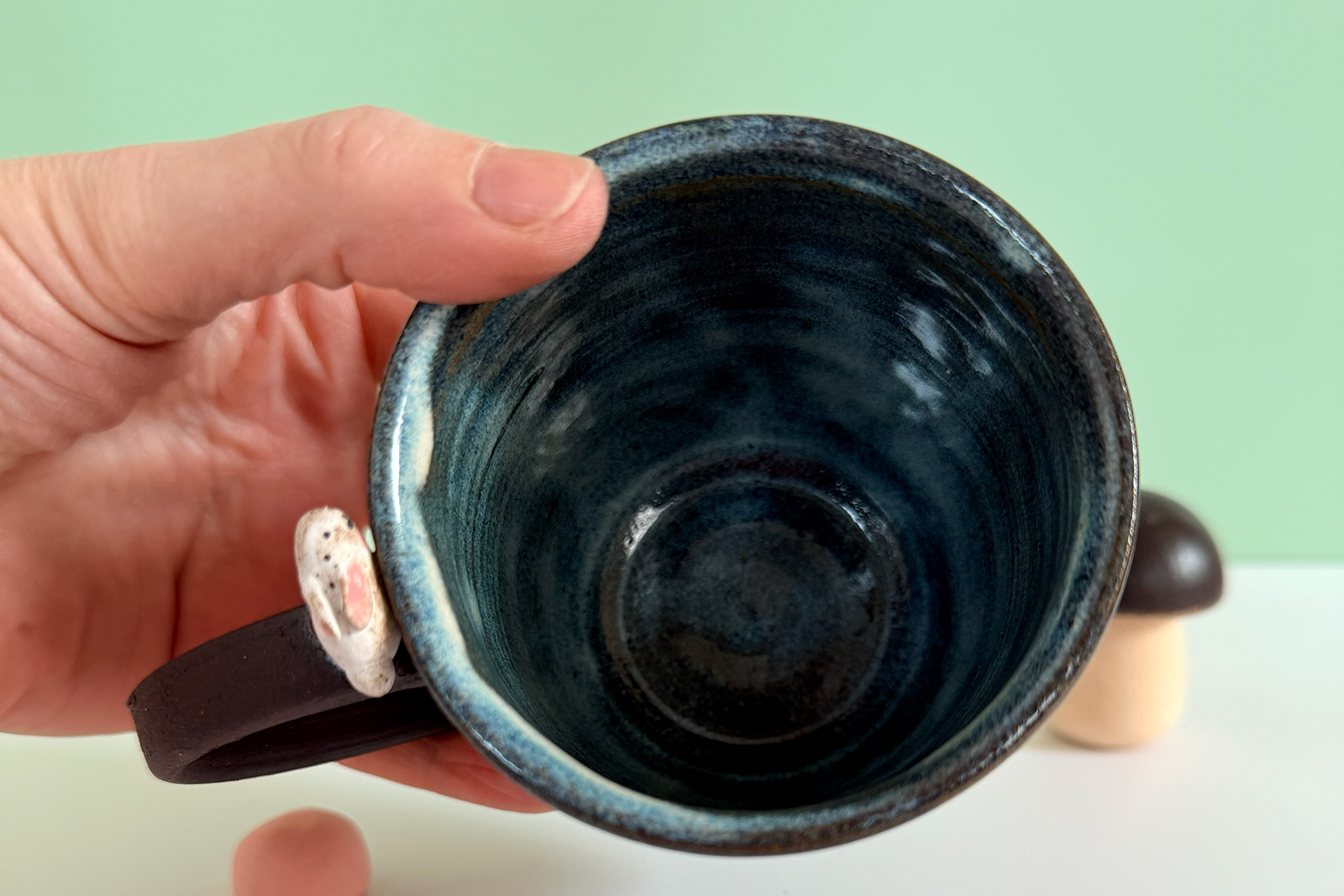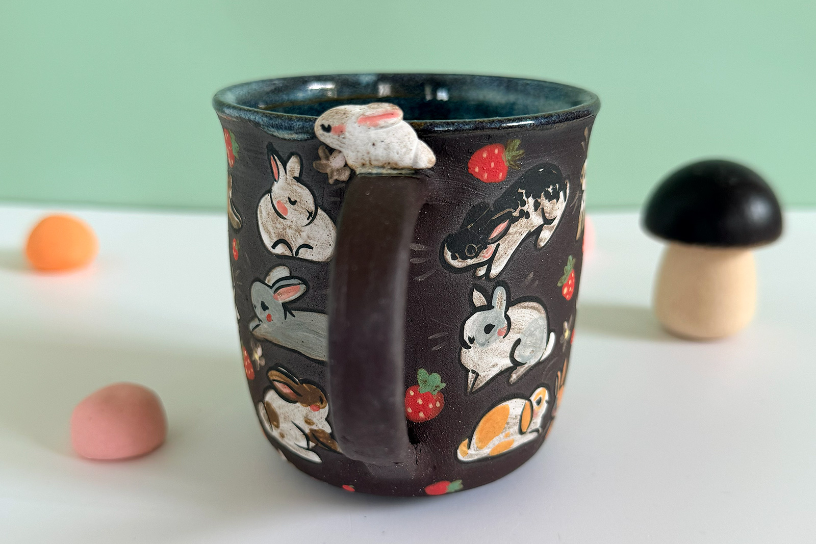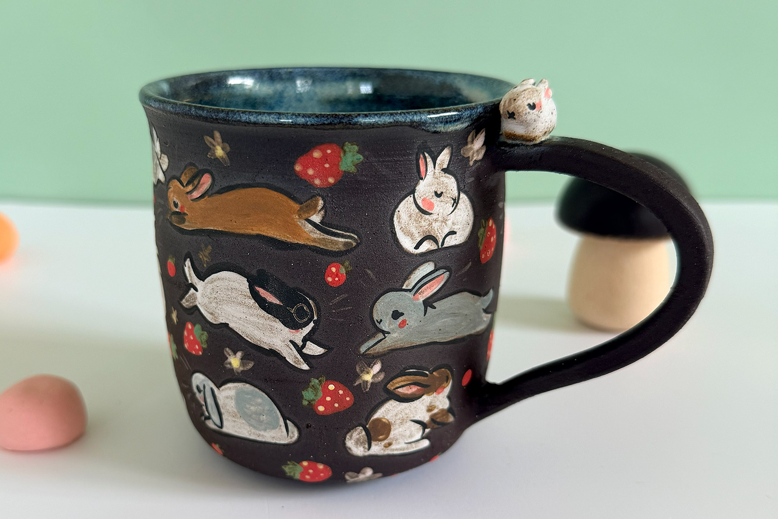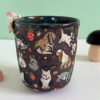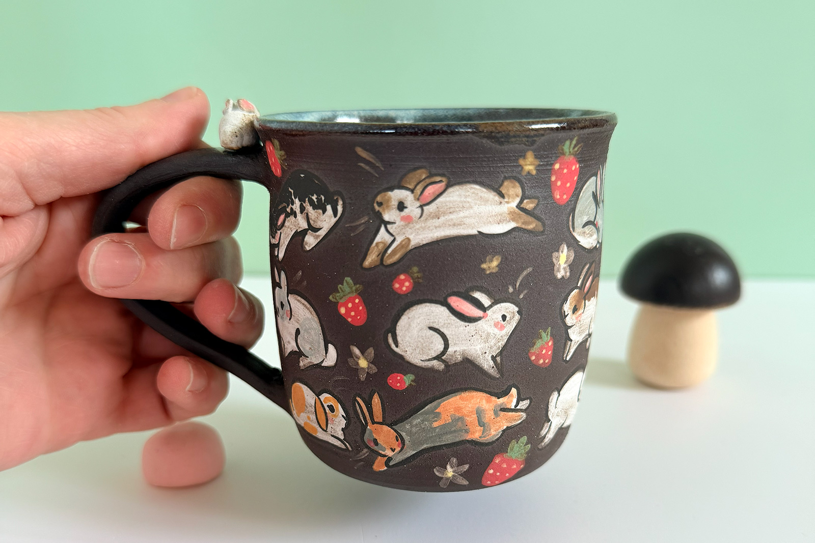 Small black stoneware mug, sculpted and entirely illustrated with an adorable original motif of bunnies and strawberries and a blue glaze inside. This is a small cup that’s made as a hand warmer, it’s 7 cm wide and tall. One of a kind, the price is for one piece.
