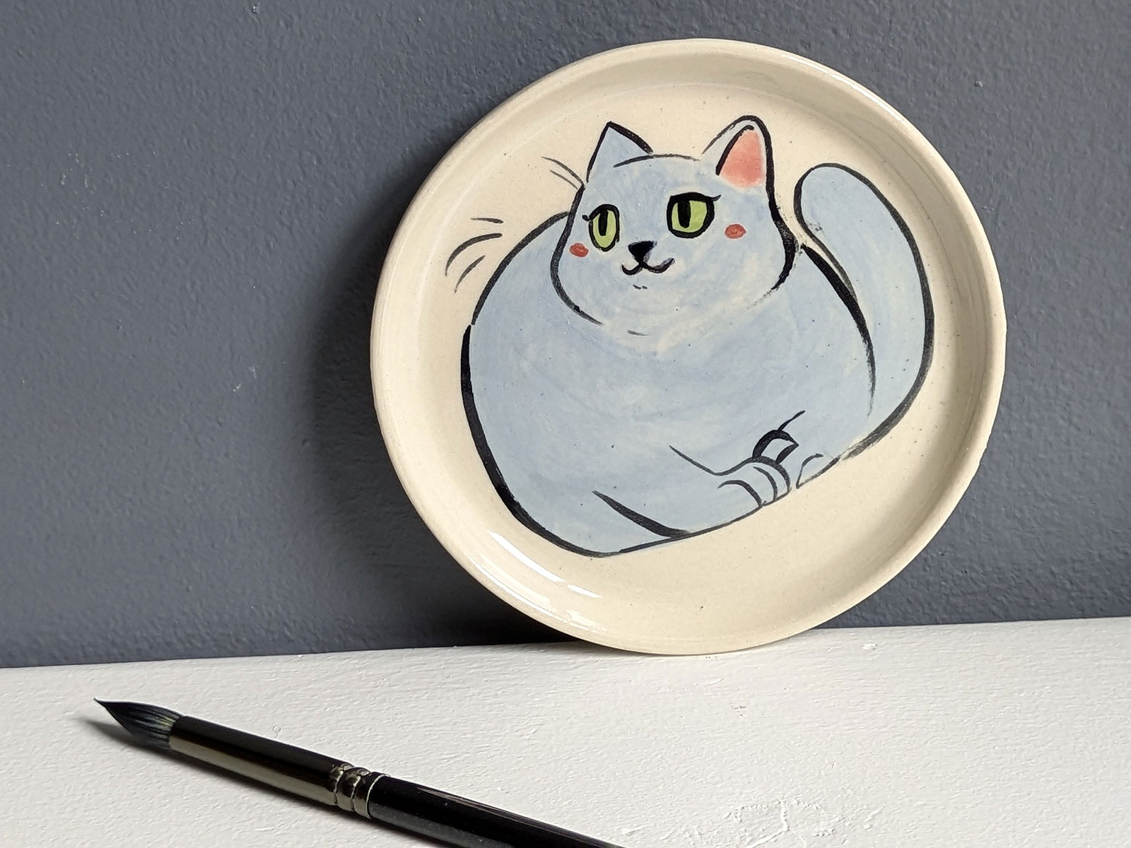A cute round grey cat in a saucer. This one of a kind handmade piece of stoneware is handmade in Québec, Canada. This is a lovely addition to a tableware collection, a hallway console or anywhere in need of a cute little piece of décor. It can be used for food as well as a trinket or jewelry tray.