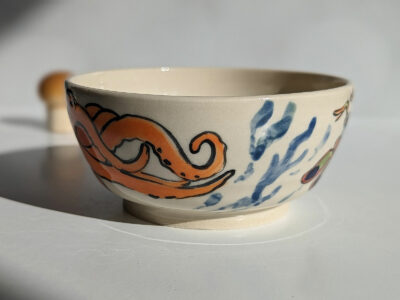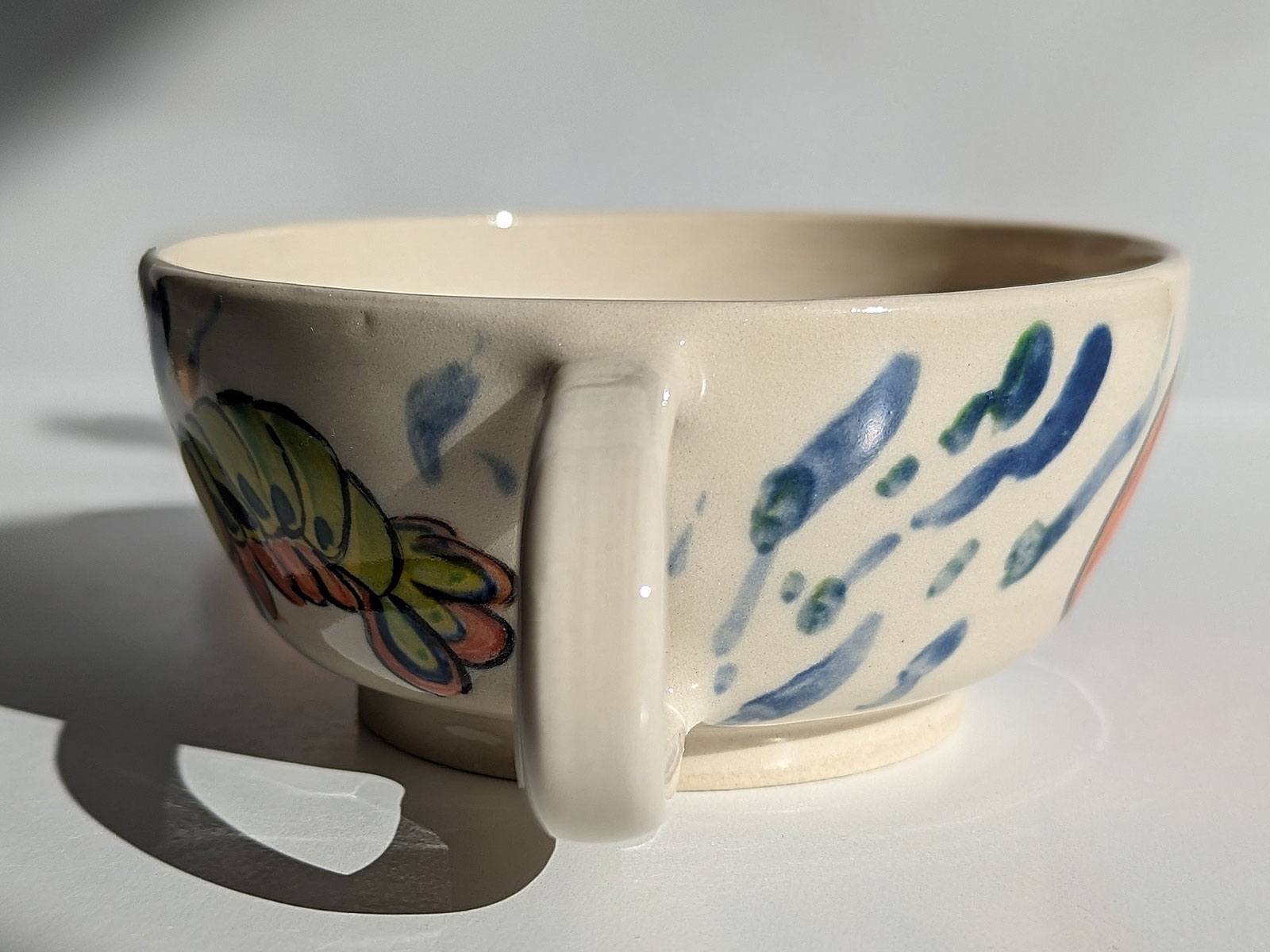 A delicate white stoneware teacup illustrated with an octopus on one side and a peacock mantis shrimp on the other, a small starfish adorns the inside of this cup. It is a unique piece that measures approximately 10 cm in diameter and 5 cm high.