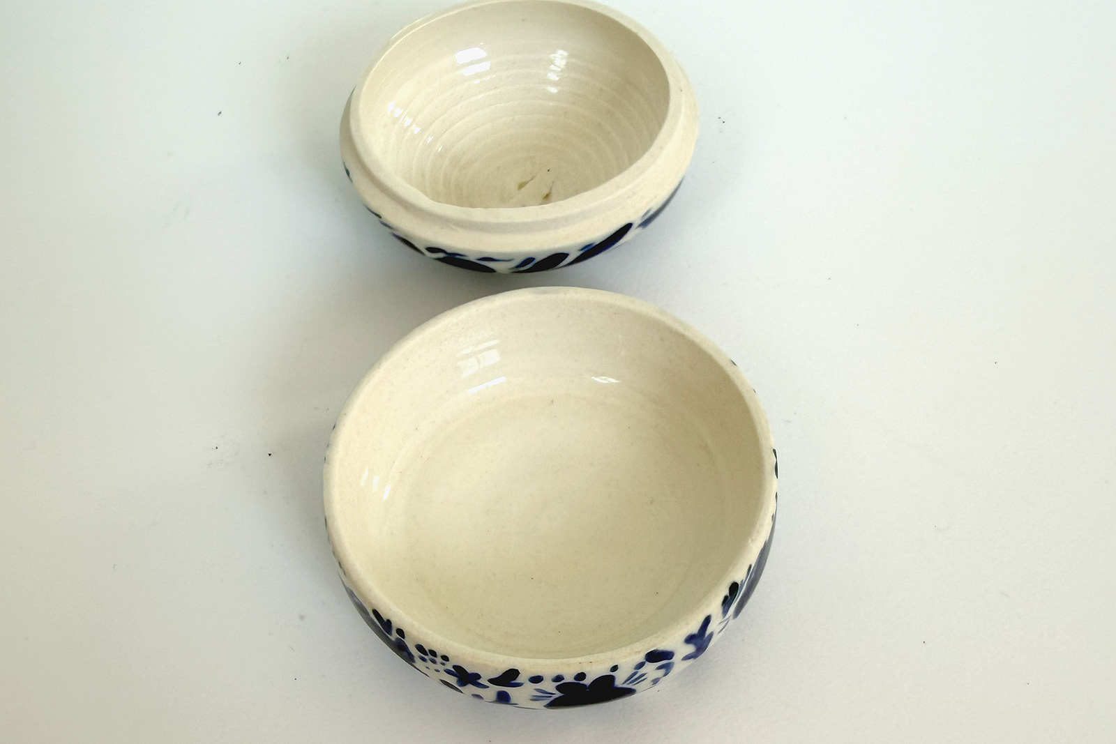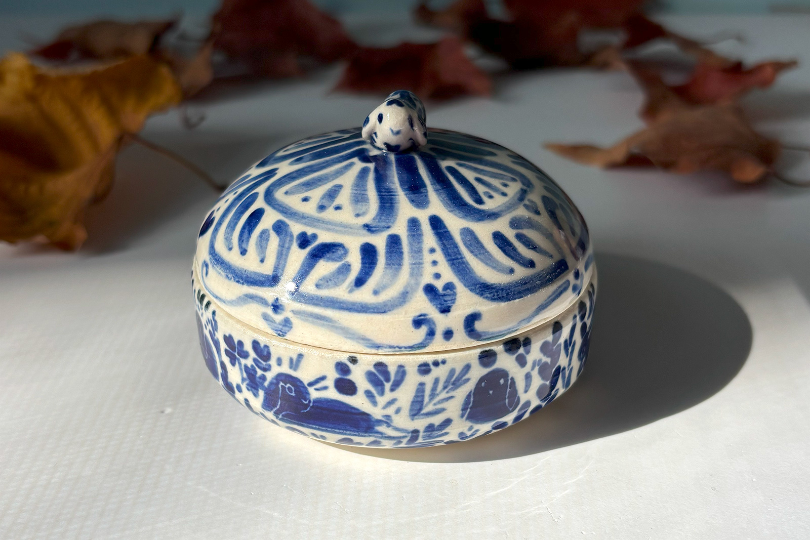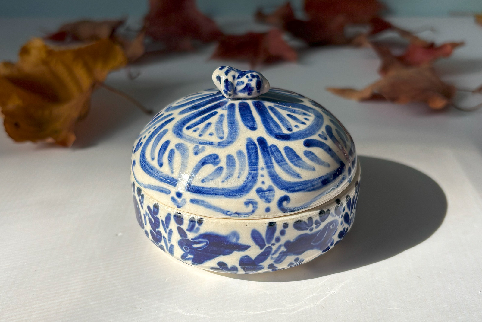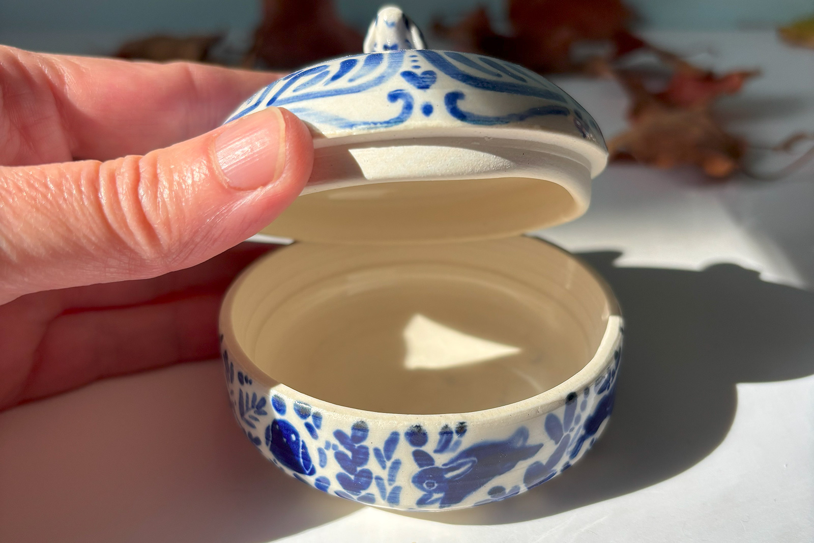 Petite boîte a bijoux avec un couvercle orné, en porcelaine. Environ 6 cm de large et 6 de haut. Parfait pour les colliers et petites boucles d’oreilles ou tout autre mini trésor.