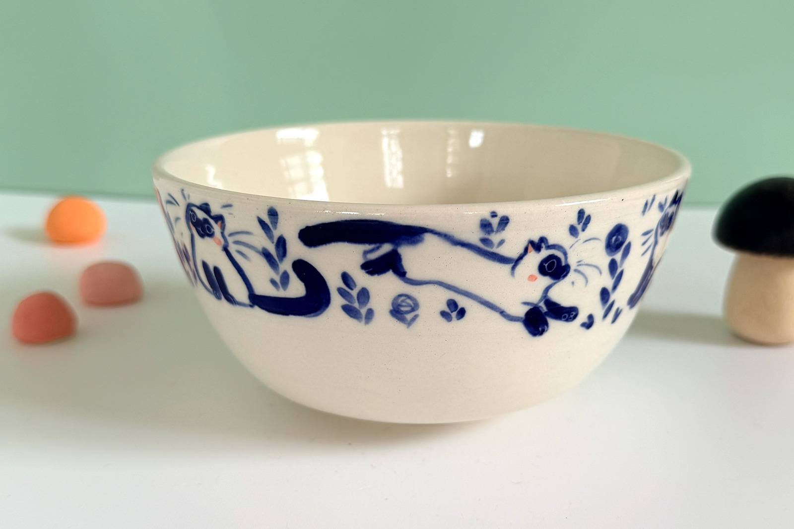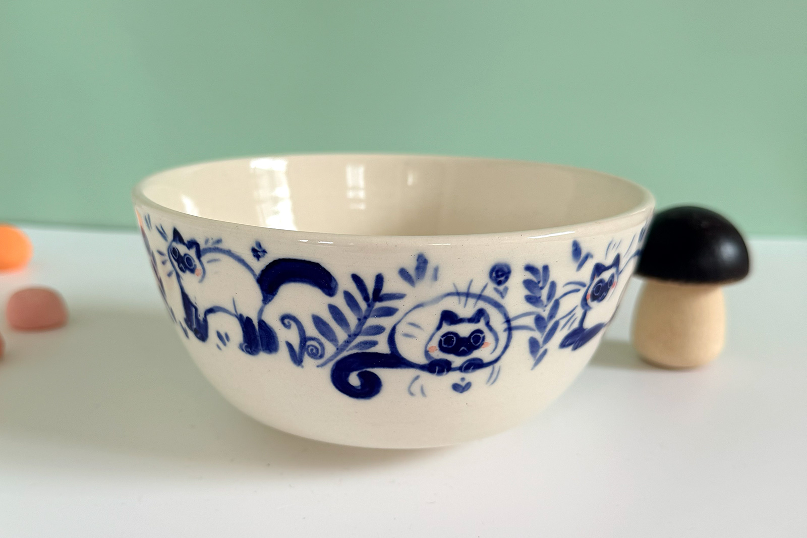 Ce bol unique, fait main, est illustré d’une frise d’adorables chats blancs et bleus. Il est émaillé pour le contact alimentaire, passe au lave-vaisselle et au micro-ondes.