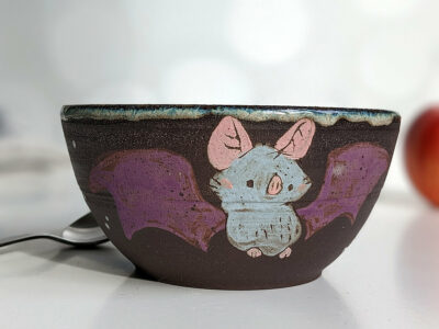 Ce bol en grès noir est une pièce unique, faite entièrement à la main. Il est peint avec deux chauve-souris. L’extérieur est brut et rugueux au toucher. L’intérieur est émaillé de crème texturé afin de le rendre utilisable pour l’alimentation.