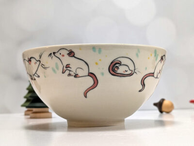 Ce bol unique, fait main, est illustré d’une frise d’adorables rats blancs Il est émaillé pour le contact alimentaire, passe au lave-vaisselle et au micro-ondes.