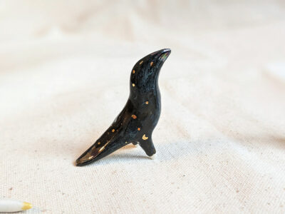 Figurine de Corbeau étoilé, céramique émaillée, détails d’or et de nacre. Environ 5 cm de haut.