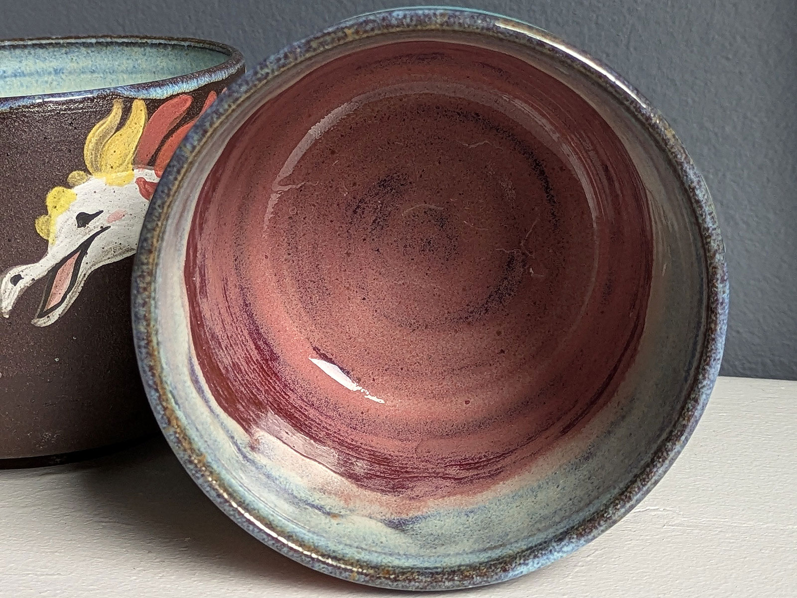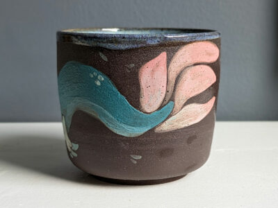 Elle est en grès noir brut à l’extérieur et émaillé de rose et bleu à l’intérieur pour un usage alimentaire. Tournée et peinte à la main, elle est unique et mesure environ 8 cm de large et 8 cm de haut.