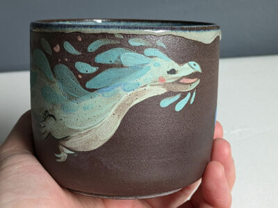 Cette coupe en grès noir illustrée d’un dragon bleu.