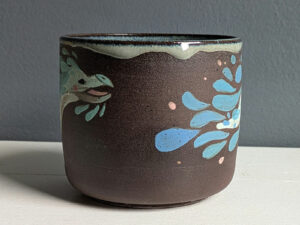 Elle est en grès noir brut à l’extérieur et émaillé de gris bleu à l’intérieur pour un usage alimentaire. Tournée et peinte à la main, elle est unique et mesure environ 8 cm de large et 8 cm de haut.