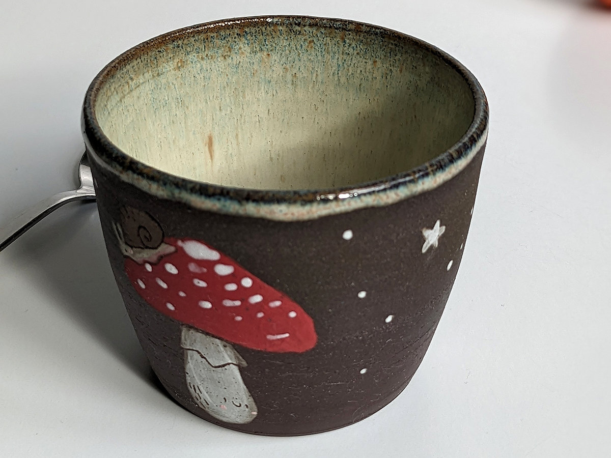 Cette coupe en grès noir a une petite histoire amusante. Un jour quelqu’un m’a citée dans un tweet d’un robot qui parlait de peindre des hérissons sur de la céramique et c’était vraiment si spécifiquement mon rayon, que j’ai fait cette tasse. Voici donc une super petite tasse sans anse avec un hérisson mignon et des champignons. Et un escargot.