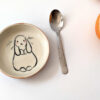 Une coupe (sans anse) en grès noir chaud illustrée d’un raton laveur et d’une citrouille. L’extérieur n’est pas émaillé, il est donc rugueux au toucher. L’intérieur est émaillé de crème, ce qui le rend sécuritaire pour la nourriture et la boisson.