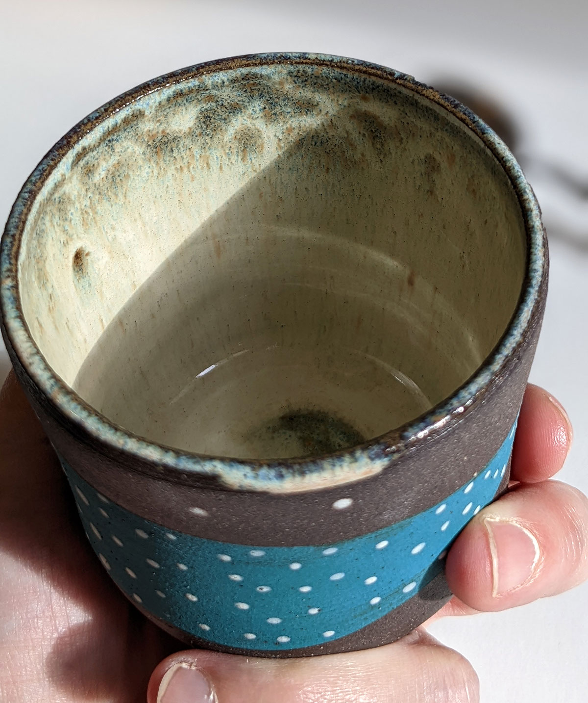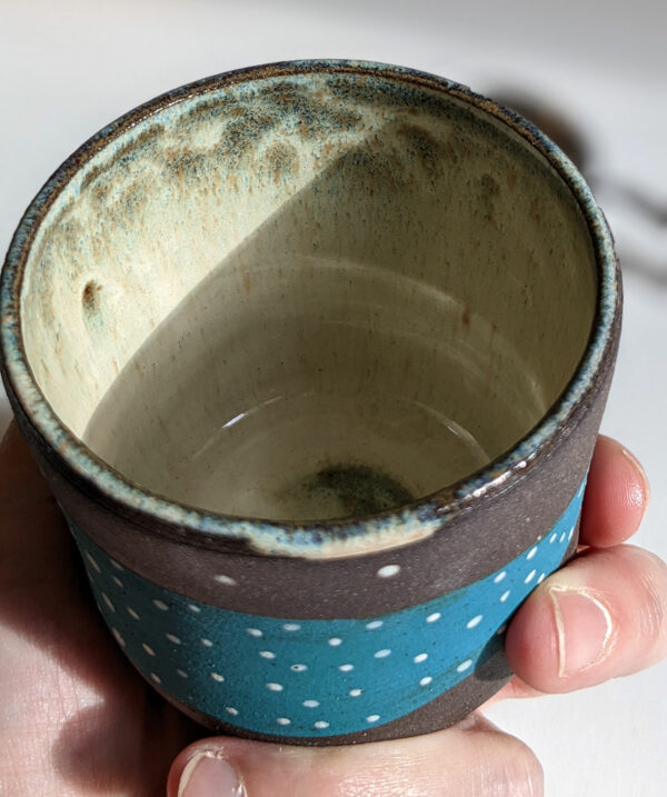 Une coupe (sans anse) en grès noir chaud illustrée requin baleine. L’extérieur n’est pas émaillé, il est donc rugueux au toucher. L’intérieur est émaillé de crème, ce qui le rend sécuritaire pour la nourriture et la boisson.