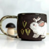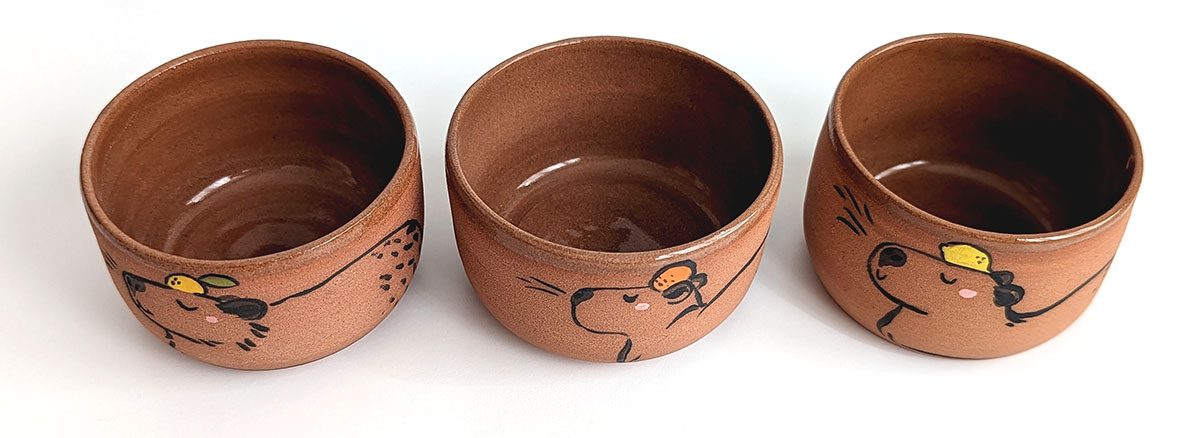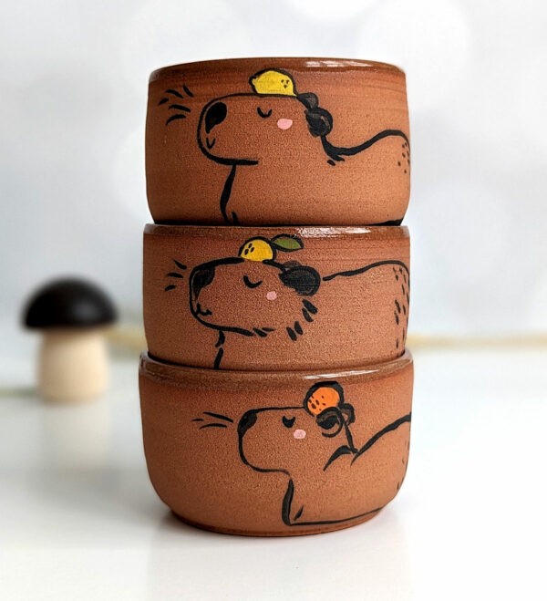 Gobelet en grès rouge orné d’un capybara et un fruit. Il existe 3 pièces similaires, une sera envoyée au hasard. Si vous le souhaitez, vous pouvez m’indiquer votre pose préférée en commentaire et j’essaierai de satisfaire le choix selon le stock restant au moment de l’envoi.