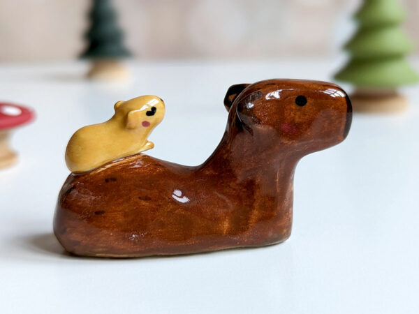 Figurine de maman Capybara portant son petit. Pièce unique sculptée à Montréal, environ 6 cm de long.