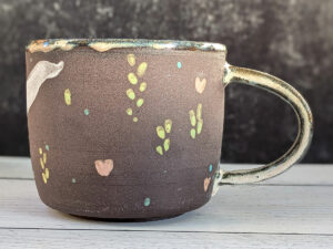 Cette tasse est brute à l’extérieur, et donc rugueuse au toucher. L’intérieur et l’anse sont émaillés afin de convenir au contact alimentaire et pour une prise en main plus agréable.