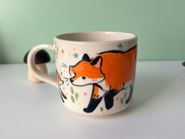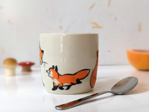 Mug en Céramique fait à la main et illustré avec une famille de renards roux. Cette tasse a été créée et réalisée entièrement dans mon studio de Montréal à partir d’une argile blanche canadienne. Cette tasse est émaillée pour le contact alimentaire, elle passe au lave vaisselle et au micro ondes. Elle est solide et durable.