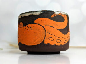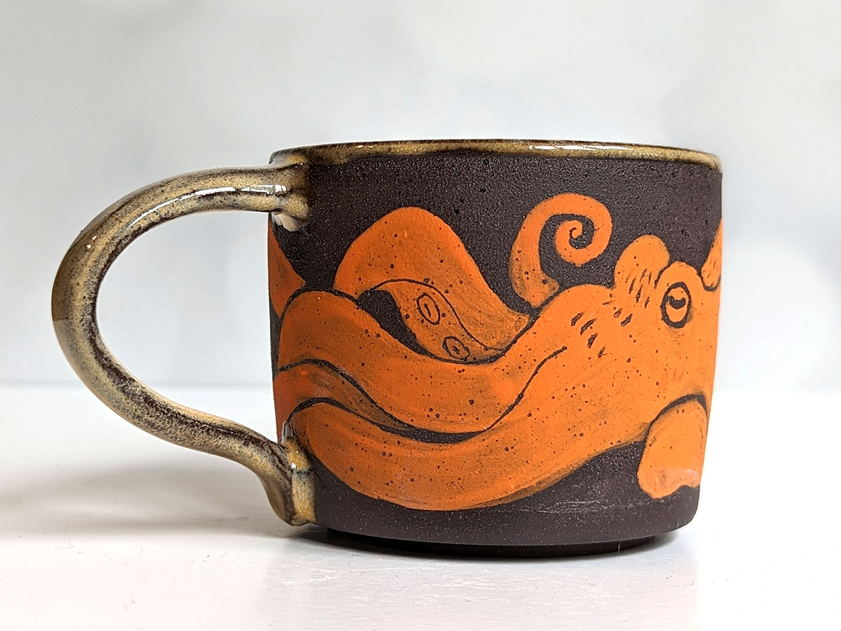 Voici un joli mug en grès noir illustré d’une pieuvre orange. Fait main, toujours, avec mon argile noire de prédilection, ce mug est émaillé à l’intérieur et sur l’anse. Cela lui permet d’être doux et de pouvoir contenir des breuvages.