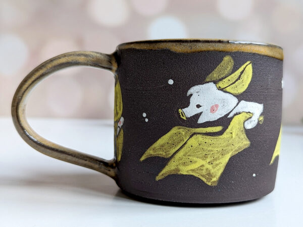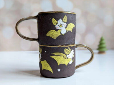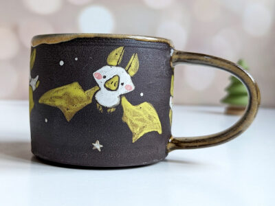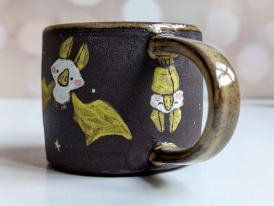 Un adorable mug en grès noir orné de chauve souris blanches et jaunes avec de petites étoiles. L’extérieur est brut et rugueux au toucher, l’intérieur est émaillé en corail sécuritaire pour l’alimentation.