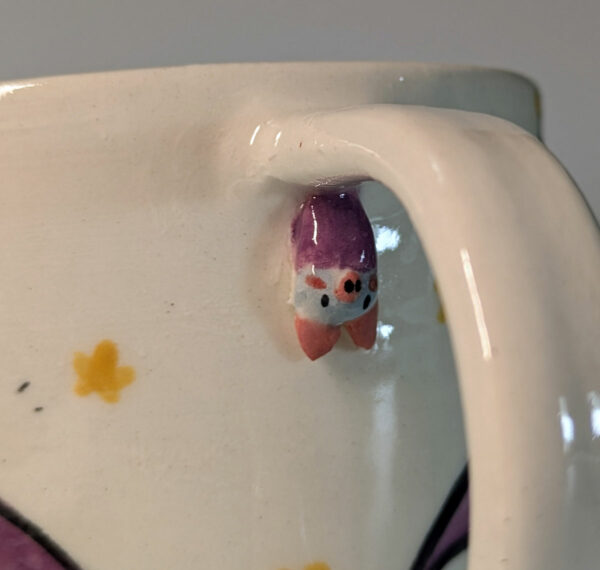 C’est un mug sculpté avec une petite chauve-souris reposant sous la poignée. C’est mignon, c’est fait à la main, c’est en porcelaine et il peut être utilisé tous les jours ainsi que devenir un objet de collection car il est unique.