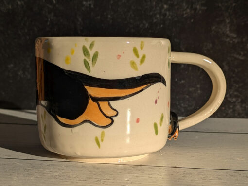 Un amour de mug avec une mini sculpture de teckel sur l’anse et un teckel qui court illustrant le tour de la tasse. C’est une pièce parfaite pour la collection ou pour l’utilisation quotidienne. Elle voudra quand même être votre mug préféré, elle passe au lave-vaisselle et au micro-ondes. Attention au petit chien sur l’anse, les détails sont très petits et ne résisteront pas aux chocs.
