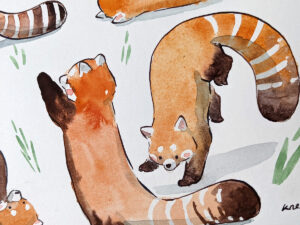 Peinture originale de 5 adorables pandas roux, sur une feuille de 23 x 15 cm environ. Ils sont peints avec une peinture aquarelle artisanale.
